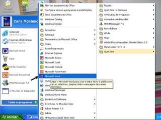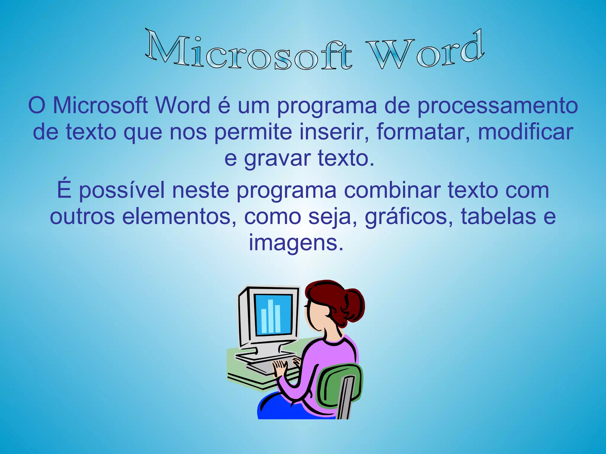 O documento fornece instruções sobre como usar as principais funções do Microsoft Word, como formatar texto, inserir imagens, criar tabelas, alterar configurações de página e mais. Explica como digitalizar, selecionar, mover e localizar informações em um documento do Word.