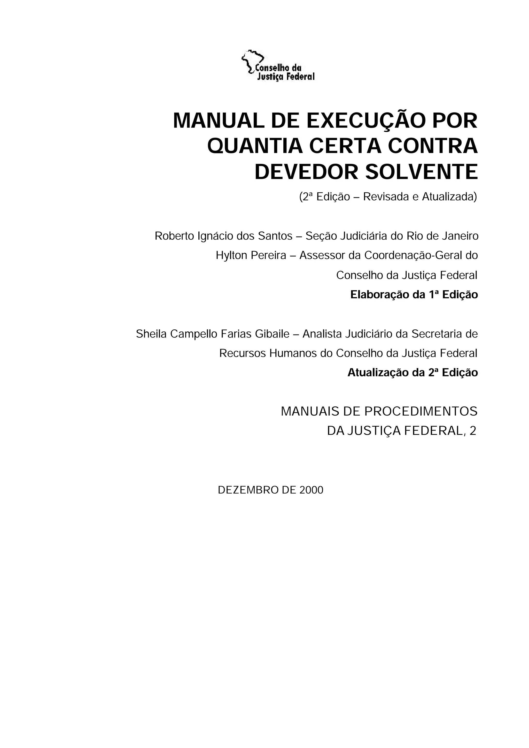 O documento apresenta um manual sobre execução por quantia certa contra devedor solvente, com instruções sobre: 1) conceito de execução; 2) fluxogramas dos procedimentos; 3) autuação, partes e título executivo na execução; 4) petição inicial, tramitação e mandado de citação; 5) penhora, avaliação, embargos e demais etapas do processo de execução. O manual tem como objetivo orientar os servidores da Justiça Federal nos procedimentos de execução por dívida.