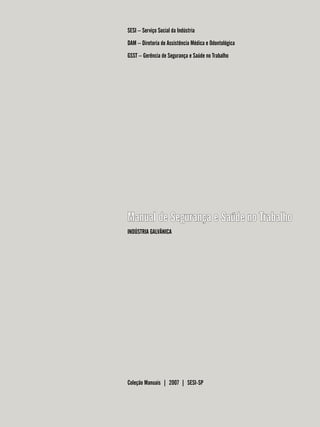 As referências destetrabalho podem ser consultadas no CENTRO DE DOCUMENTAÇÃO E INFORMAÇÃO – CDI Tel.: (11) 3834-0664 / (11) 3834-9102 e-mail: cdi@sesisp.org.br sst@sesisp.org.br Diretoria de Assistência Médica e Odontológica Coordenação Editorial Marilia Monti Augusto Gouvêa Dourado Consultoria Técnica Bernardo Bedrikow Revisão Técnica Mário Luiz Fantazzini Produção Coordenadoria de Comunicação e Marketing Elaboração Andréa Yuriko Miyaoi Magarifuchi Antonio de Lima Ayrton Seiji Yamada Cássia Regina Sanchez Cláudio dos Santos Pivotto Dorival Abrahão de Oliveira Emilia Maria Bongiovanni Watanabe Fabiola Incontri M. Brandão Lopes Ferriello Giseli Rodrigues Cardoso José Dias Ferreira Josiane Lopes Monteiro Luiz Fernando da Silva Marcia Marano Moreno Marina Reiné dos S. Viana Paulo Sérgio Alguin Rosângela Costa Lacerda Vaz Uilian Pedro da Silva Ulisses de Medeiros Coelho Júnior Vera Cristina G. C. Lauand Wellington Silva Chaves Revisão de Texto Fabiana Lancerotti Projeto Gráfico e Diagramação Shadow Design Ilustração Hamilton Pinto Alves Viana Tiragem 5000 exemplares © 2007, by SESI-SP São Paulo, 2007 |manualdesegurançaesaúdenotrabalho|indústriagalvânica|informaçõescomplementares| |páginas258e259|