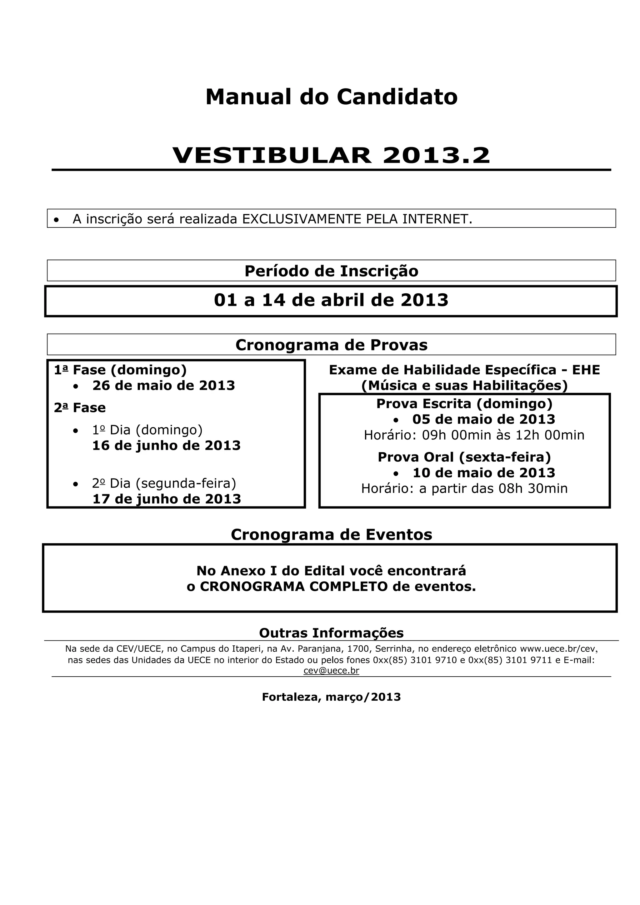 O manual apresenta as informações sobre o vestibular 2013.2 da Universidade Estadual do Ceará, incluindo o cronograma de eventos, cursos e vagas disponíveis, inscrições, fases da prova, condições de realização e resultado final. O candidato deve ficar atento às datas do cronograma, optar por curso e língua estrangeira na inscrição, e levar documento de identidade original no dia da prova.