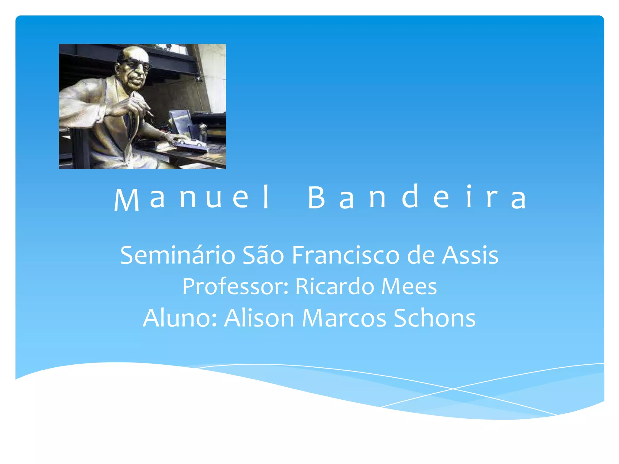 Manuel Bandeira foi um poeta modernista brasileiro nascido em 1886 em Recife. Fez parte da geração de 1922 e publicou seu primeiro livro "A Cinza das Horas" em 1917, marcado por um tom fúnebre e estilo parnasiano-simbolista. Bandeira possui um estilo simples e direto em sua poesia, abordando temas cotidianos de forma lírica. Ele publicou diversos livros ao longo de sua carreira.