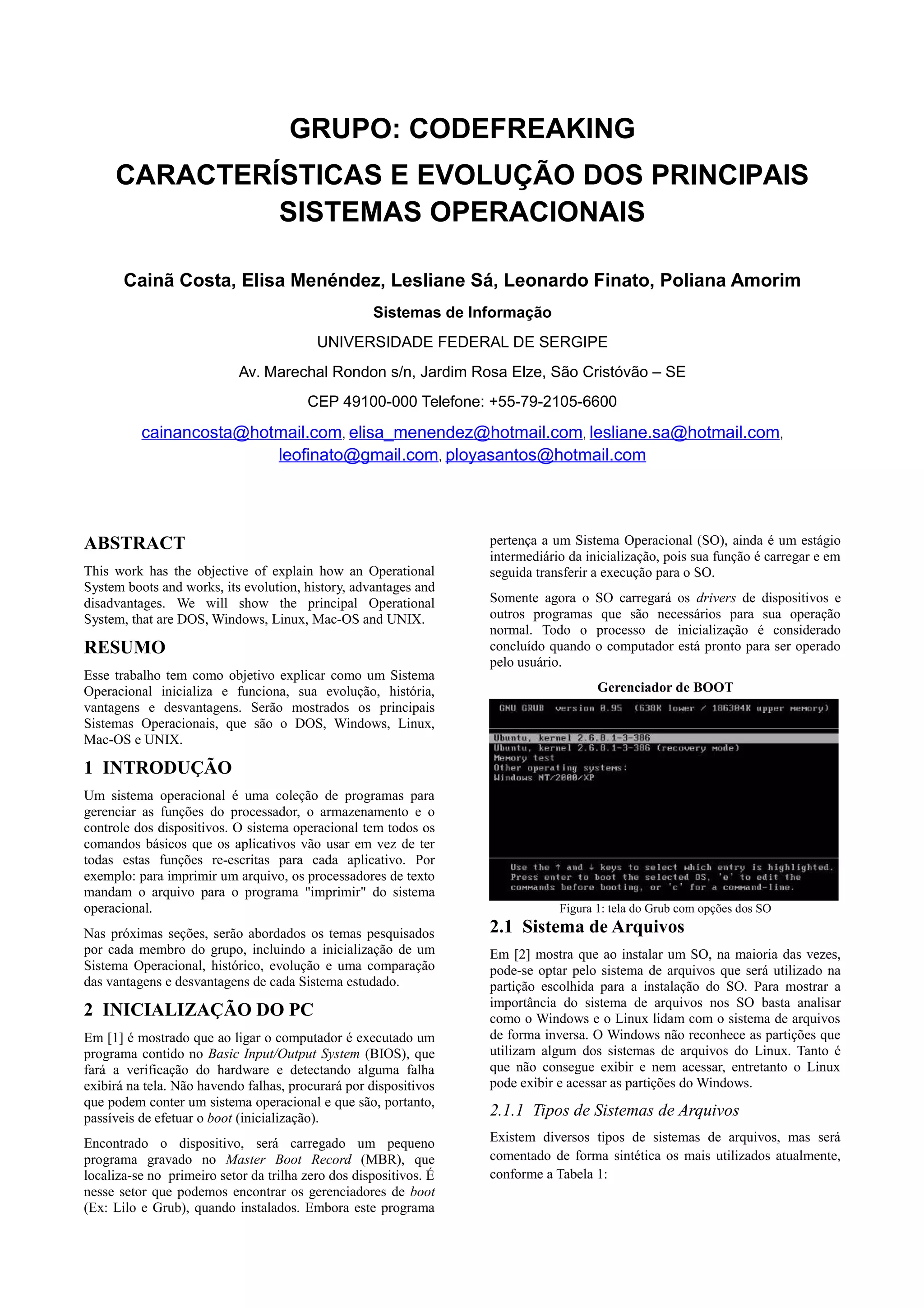 Este documento descreve a inicialização e funcionamento de sistemas operacionais, sua história e evolução. Apresenta os principais sistemas operacionais: DOS, Windows, Linux, MacOS e UNIX, mostrando como cada um surgiu e evoluiu ao longo do tempo. Explica também os principais tipos de sistemas de arquivos utilizados.