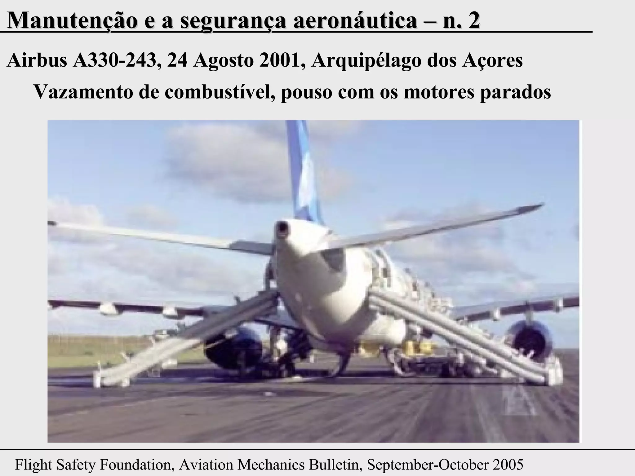 Um Airbus A330-243 sofreu um vazamento de combustível após a instalação incorreta de uma linha hidráulica e combustível durante manutenção, levando os motores a desligarem durante o voo. A tripulação realizou procedimentos de memória ao invés de consultar os manuais e agravou o vazamento. O pouso de emergência foi realizado com sucesso, mas resultou em ferimentos leves e graves em passageiros.