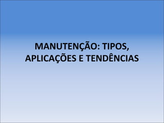 O documento discute os tipos, aplicações e tendências da manutenção industrial. Apresenta o histórico da manutenção desde o século XVI e descreve os principais tipos de manutenção, como corretiva, preventiva e preditiva. Também aborda metodologias como Manutenção Centrada na Confiabilidade, TPM e 6 Sigma, além de índices e tendências atuais da manutenção.