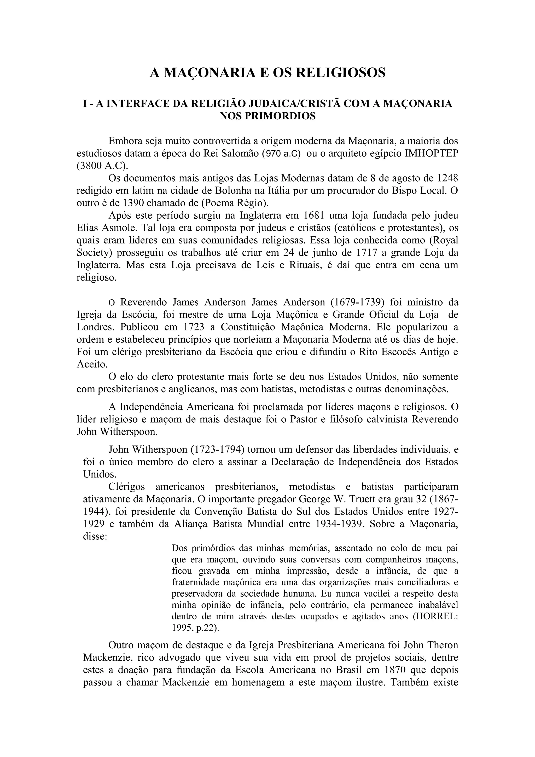 O documento discute a relação entre a maçonaria e religiões nos primórdios e no Brasil. Mostra que clérigos de várias denominações participaram ativamente da maçonaria e lideraram importantes revoluções no Brasil visando maior liberdade política e redução do poder da Igreja Católica. O padre Feijó, um maçom e líder político, promoveu reformas seculares durante sua regência no Brasil.