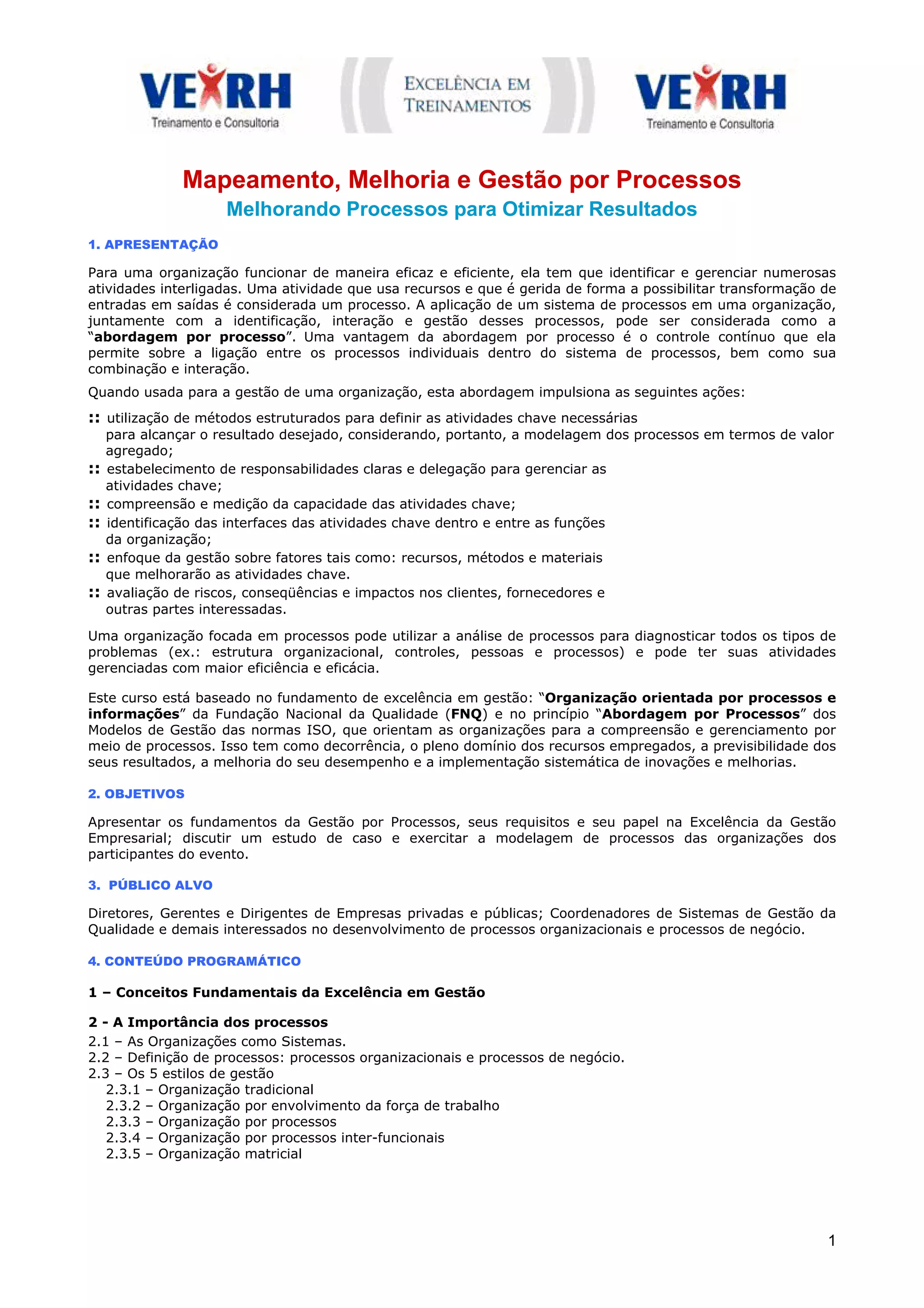Este documento discute a importância da abordagem por processos para melhorar a eficiência e eficácia organizacional. Ele explica como mapear, analisar e redesenhar processos usando ferramentas como fluxogramas para melhorar continuamente os resultados. O documento também fornece um programa com conceitos, estudos de caso e exercícios para ensinar sobre gestão por processos.