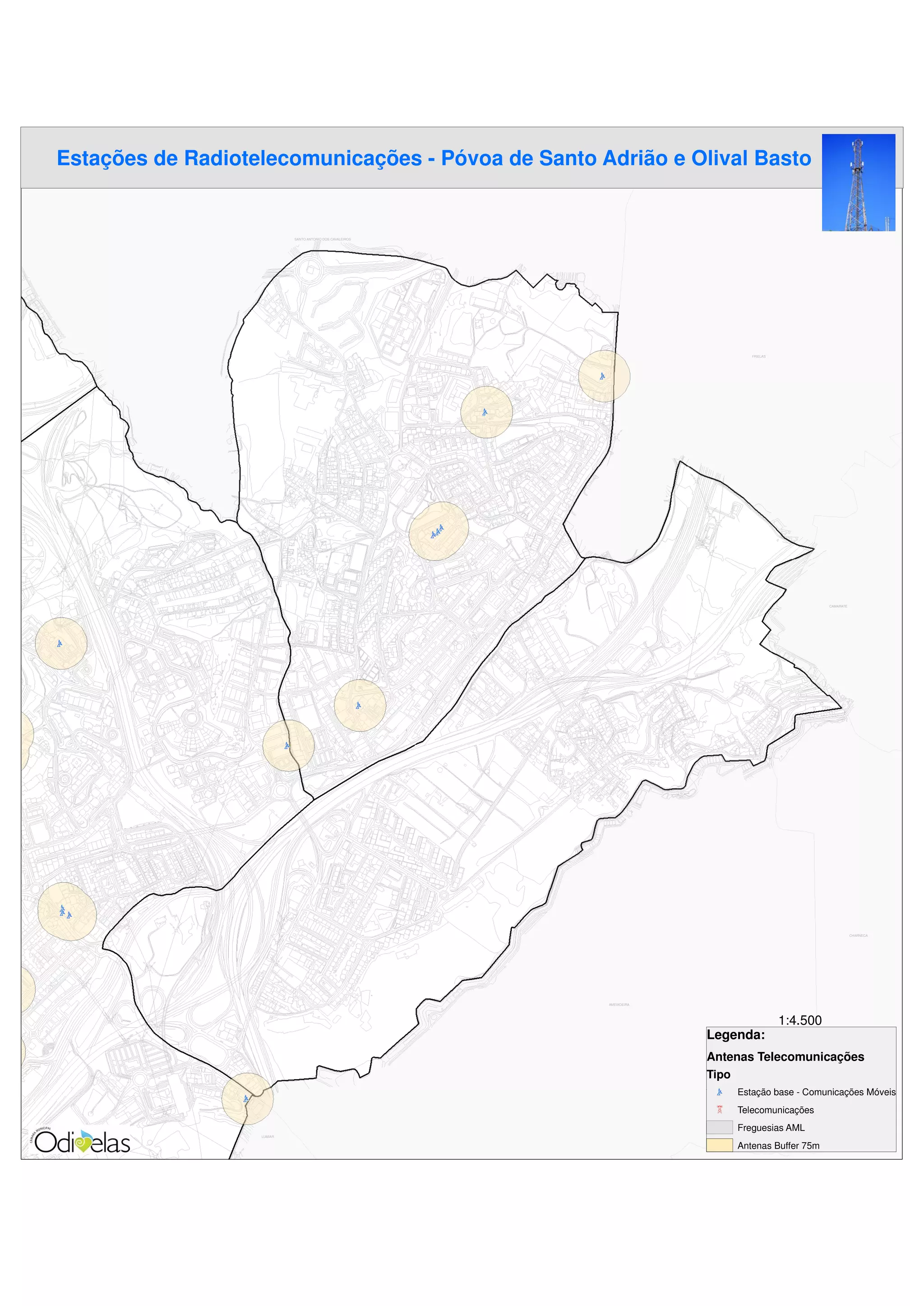 Este mapa mostra as localizações de estações de radiocomunicação em Póvoa de Santo Adrião, Olival Basto, Santo António dos Cavaleiros, Frielas, Camarate, Charneça, Ameixoeira e Lumiar, incluindo antenas para comunicações móveis e telecomunicações.