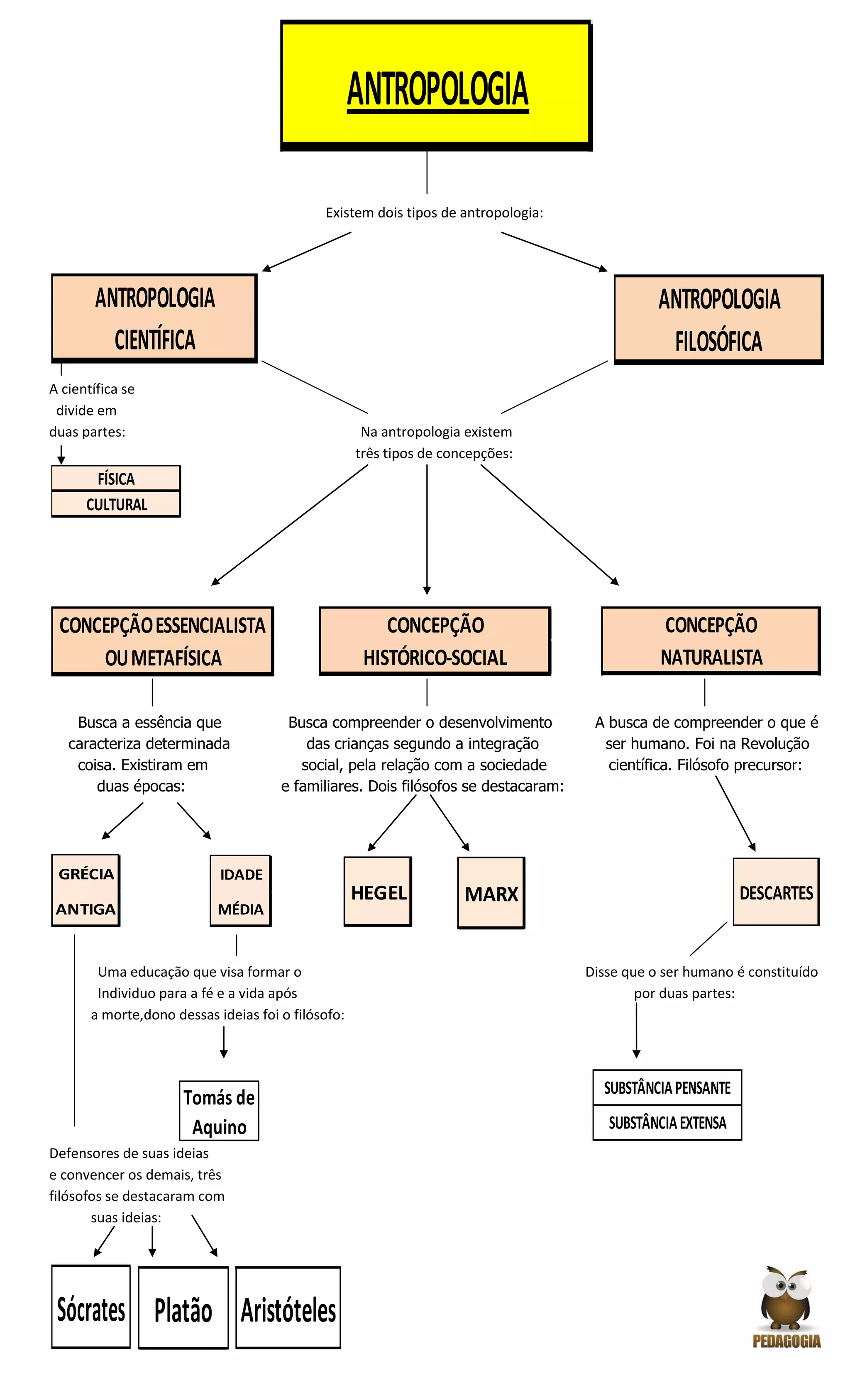 O documento discute três tipos de antropologia - científica, filosófica e conceitual - e vários filósofos associados a cada uma, incluindo Sócrates, Platão, Aristóteles, Tomás de Aquino, Hegel, Marx e Descartes.