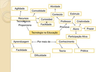 O documento discute como a tecnologia na educação pode promover a agilidade, comodidade, conteúdo estimulante e recursos tecnológicos para professores e alunos, facilitando a aprendizagem ativa, a participação e a ligação entre teoria e prática de forma prazerosa e criativa.