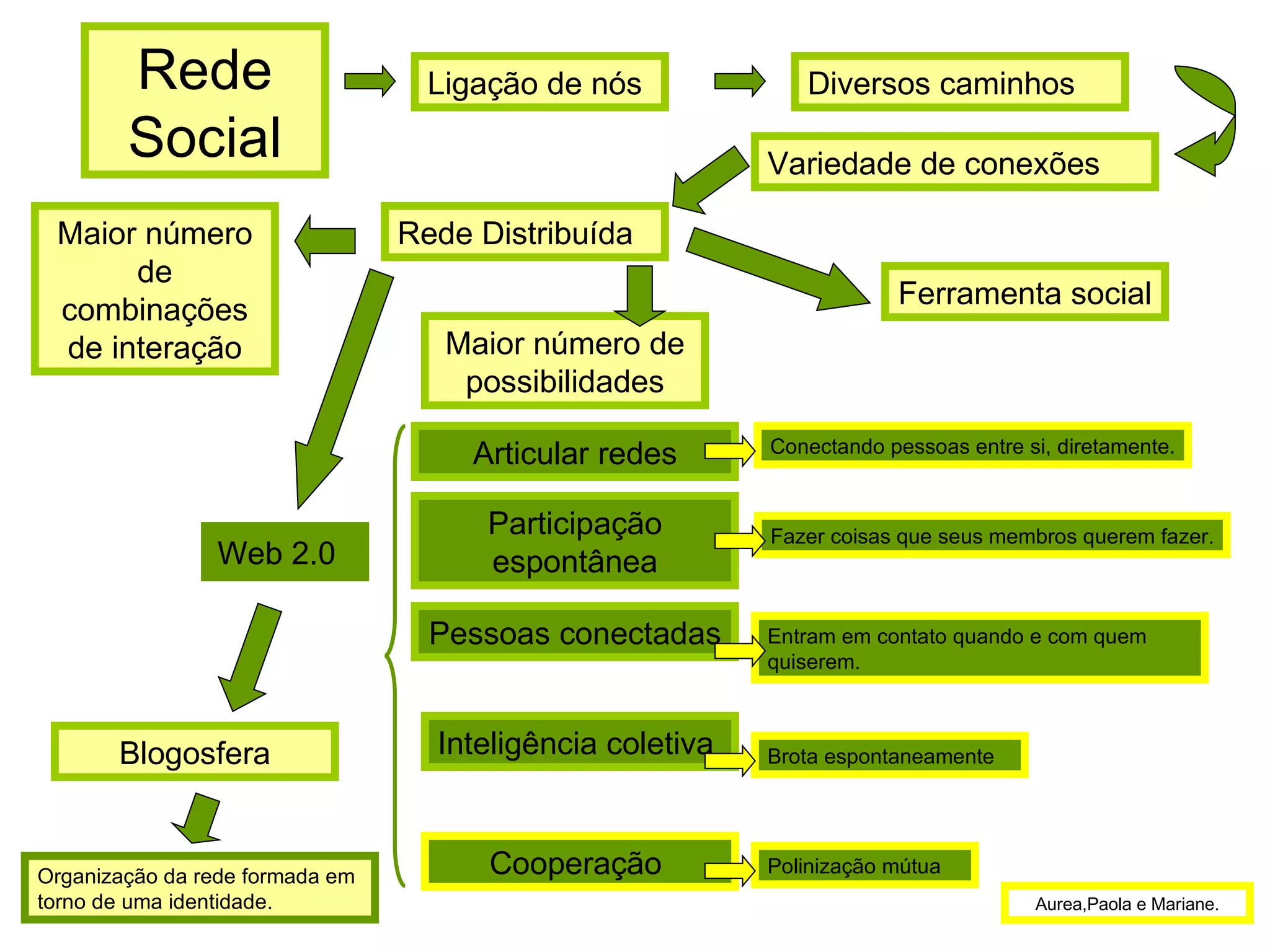 O documento discute as características de redes sociais, incluindo a capacidade de conectar pessoas entre si diretamente, permitindo uma variedade de conexões e interações espontâneas entre membros que cooperam e se polinizam mutuamente.