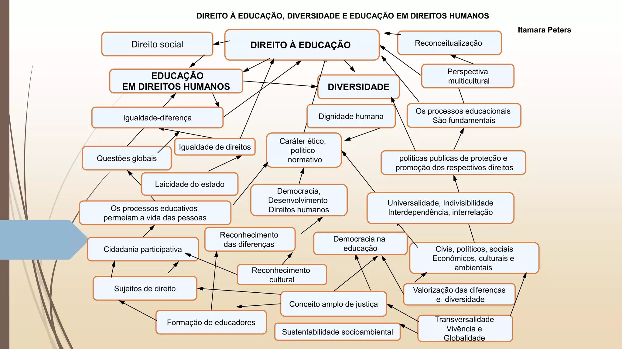 O documento discute a educação em direitos humanos, diversidade e o direito à educação. Aborda conceitos como justiça, cidadania participativa, reconhecimento cultural e os direitos civis, políticos, sociais, econômicos e ambientais. Também discute como os processos educativos permeiam a vida das pessoas e questões globais como democracia, desenvolvimento e direitos humanos.