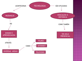 Este documento discute como as tecnologias digitais estão mudando a educação e a aprendizagem. Ele explica que as mídias como filmes, internet e televisão estão sendo utilizadas tanto na educação a distância quanto nas aulas presenciais e que é importante planejá-las adequadamente para uma boa compreensão. Também discute como as escolas estão se adaptando às novas tecnologias com laboratórios de informática e como os professores as estão integrando no processo de ensino.