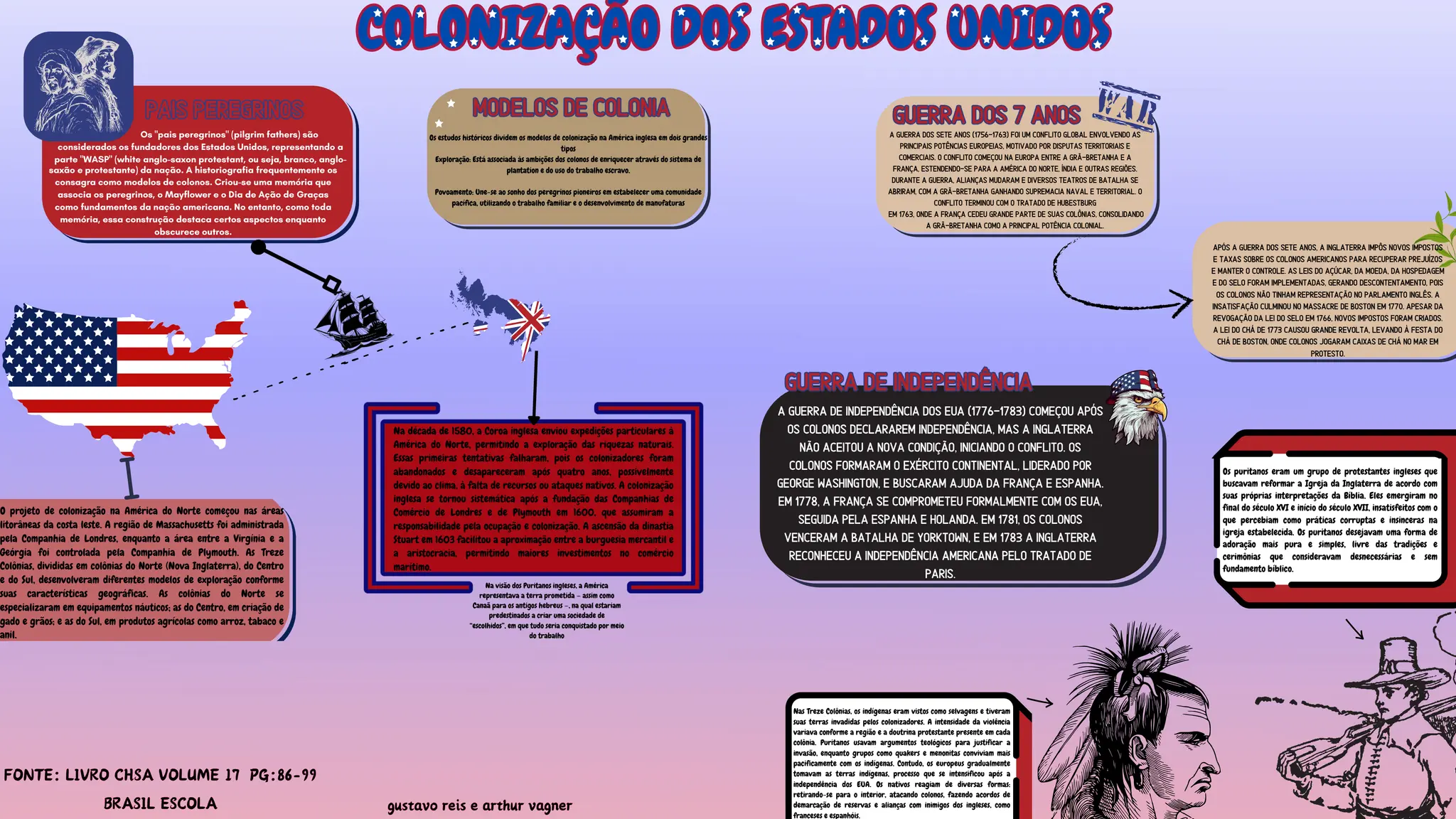 A colonização dos Estados Unidos começou na década de 1580 com expedições inglesas, mas somente se tornou sistemática em 1600 com a fundação de companhias de comércio. A guerra dos sete anos consolidou a Grã-Bretanha como uma potência colonial, levando à insatisfação dos colonos com os novos impostos e, eventualmente, à independência dos EUA entre 1776 e 1783. Diferentes modelos de colonização foram desenvolvidos nas treze colônias, resultando em diversas interações com populações indígenas e na formação de uma identidade americana.