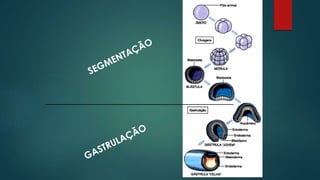 O documento aborda a embriologia, foco na reprodução e desenvolvimento embrionário, destacando processos como a fecundação, gametogênese e as fases do desenvolvimento, como segmentação, gastrulação e organogênese. Classifica os organismos em vivíparos, ovíparos, ovovivíparos e hermafroditas, detalhando a nutrição do embrião e as técnicas de controle de natalidade como vasectomia. Além disso, menciona agentes teratogênicos que podem causar malformações congênitas durante o desenvolvimento embrionário.
