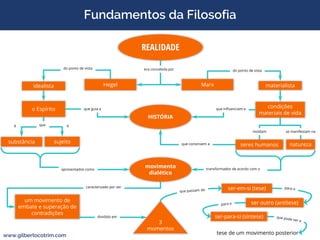 O documento explora os fundamentos da filosofia através das ideias de Hegel e Marx, destacando a interação entre a realidade, o espírito e as condições materiais de vida. Apresenta o movimento dialético como um processo de embate e superação de contradições, dividido em tese, antítese e síntese. Conclui que esses fatores moldam a história e a natureza dos seres humanos.