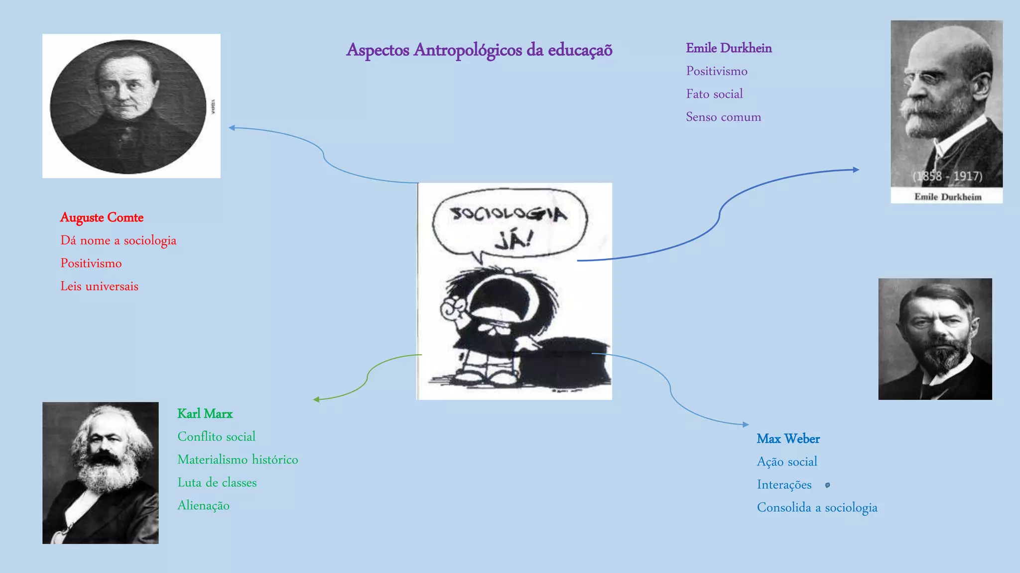 Auguste Comte é considerado o fundador da sociologia e desenvolveu o positivismo, uma abordagem que busca leis universais para explicar a sociedade. Karl Marx aplicou o materialismo histórico para analisar a luta de classes e a alienação resultante do conflito social. Emile Durkheim estudou como os fatos sociais moldam o senso comum das pessoas. Max Weber ajudou a consolidar a sociologia analisando a ação social e as interações que formam as instituições sociais.