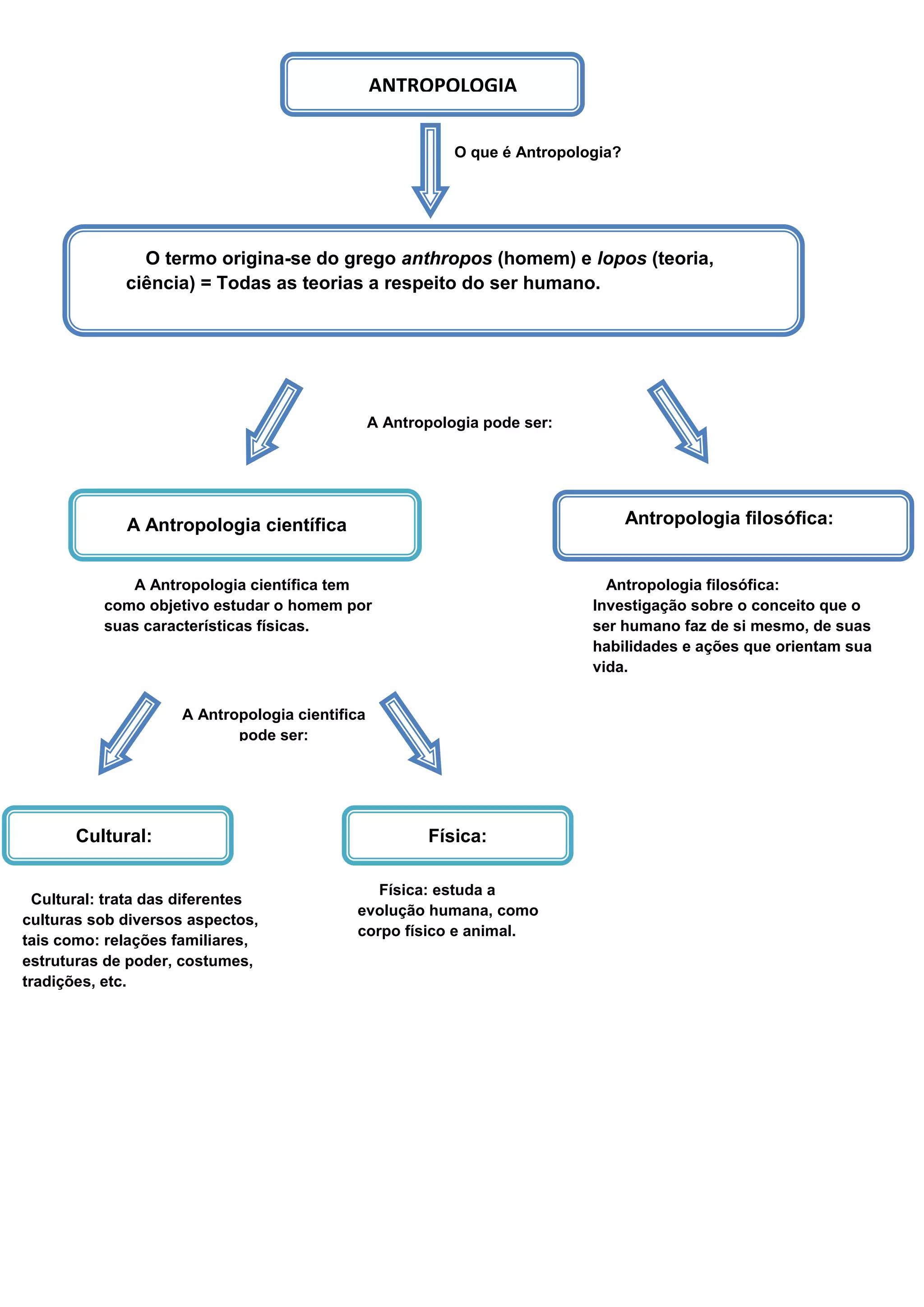 A Antropologia estuda o ser humano sob três perspectivas: a antropologia filosófica investiga como os humanos se veem a si mesmos, a antropologia cultural analisa as diferentes culturas humanas, e a antropologia física examina a evolução física e biológica dos humanos.