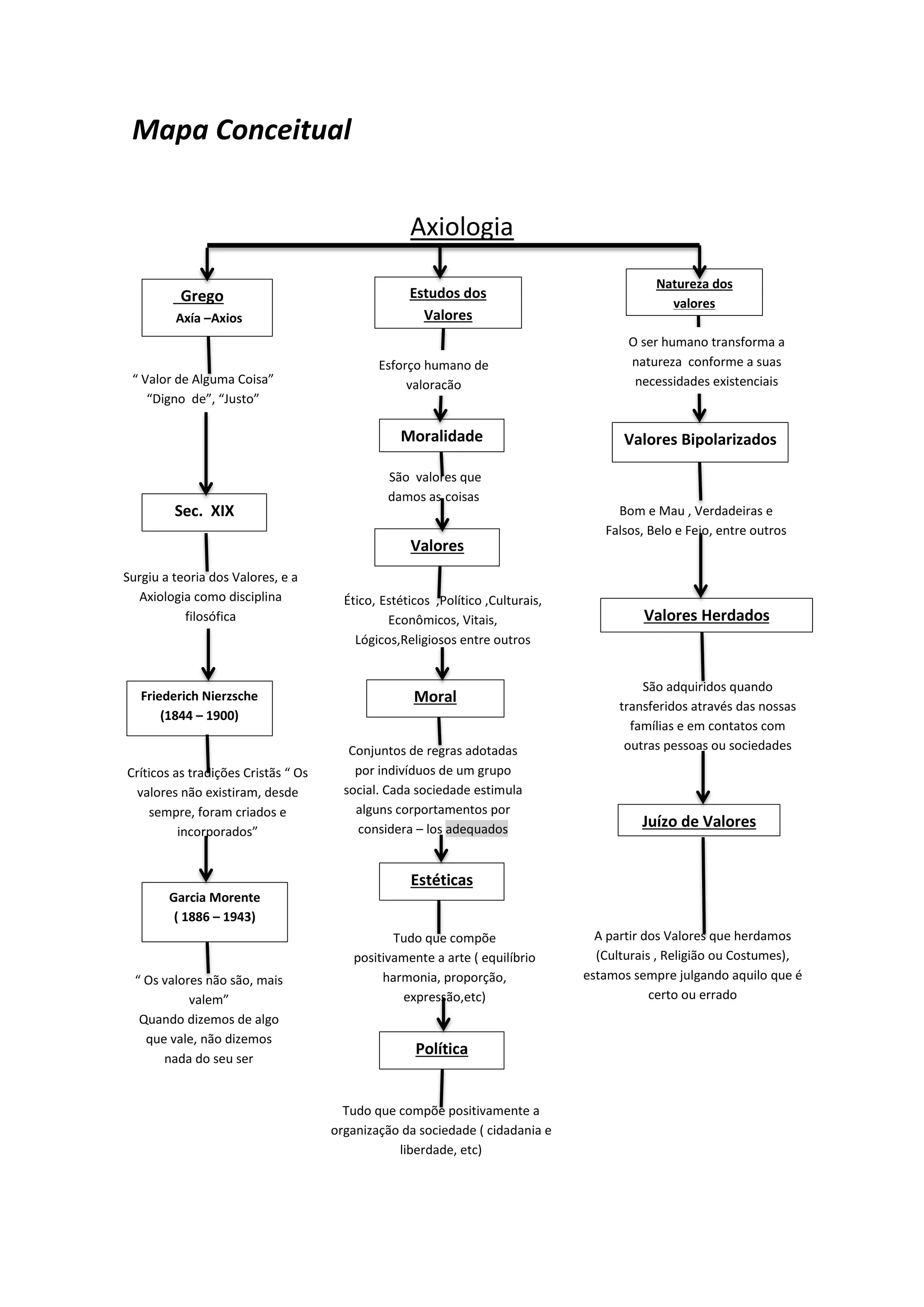 O documento apresenta um mapa conceitual sobre axiologia, que estuda os valores. Apresenta a origem da palavra valor no grego e seu significado. Discute os estudos dos valores no século XIX e pensadores como Nietzsche que criticaram valores tradicionais. Apresenta que valores podem ser herdados culturalmente ou surgirem de julgamentos. Exemplifica valores como éticos, estéticos e políticos.