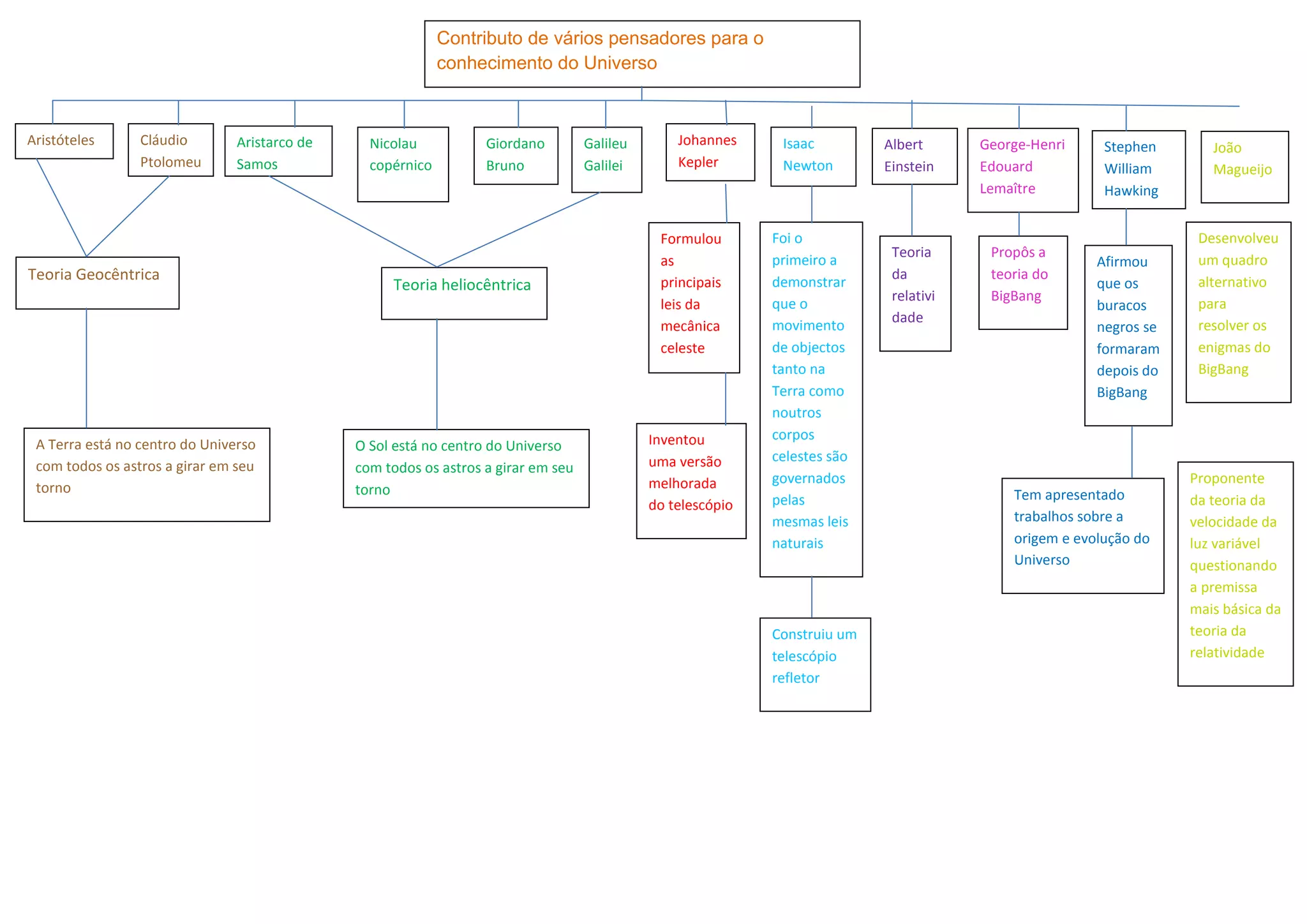 Vários pensadores contribuíram para o entendimento do Universo ao longo da história, propondo teorias como a geocêntrica de Ptolomeu e a heliocêntrica de Copérnico. Galileu, Kepler, Newton e Einstein formularam leis que governam o movimento celeste, enquanto Lemaître, Hawking e outros exploraram a origem e evolução do Universo, como a teoria do Big Bang. Magueijo questionou premissas estabelecidas com novas ideias.