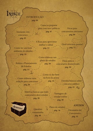 1) O documento fornece dicas para concurseiros iniciantes se prepararem para concursos públicos.
