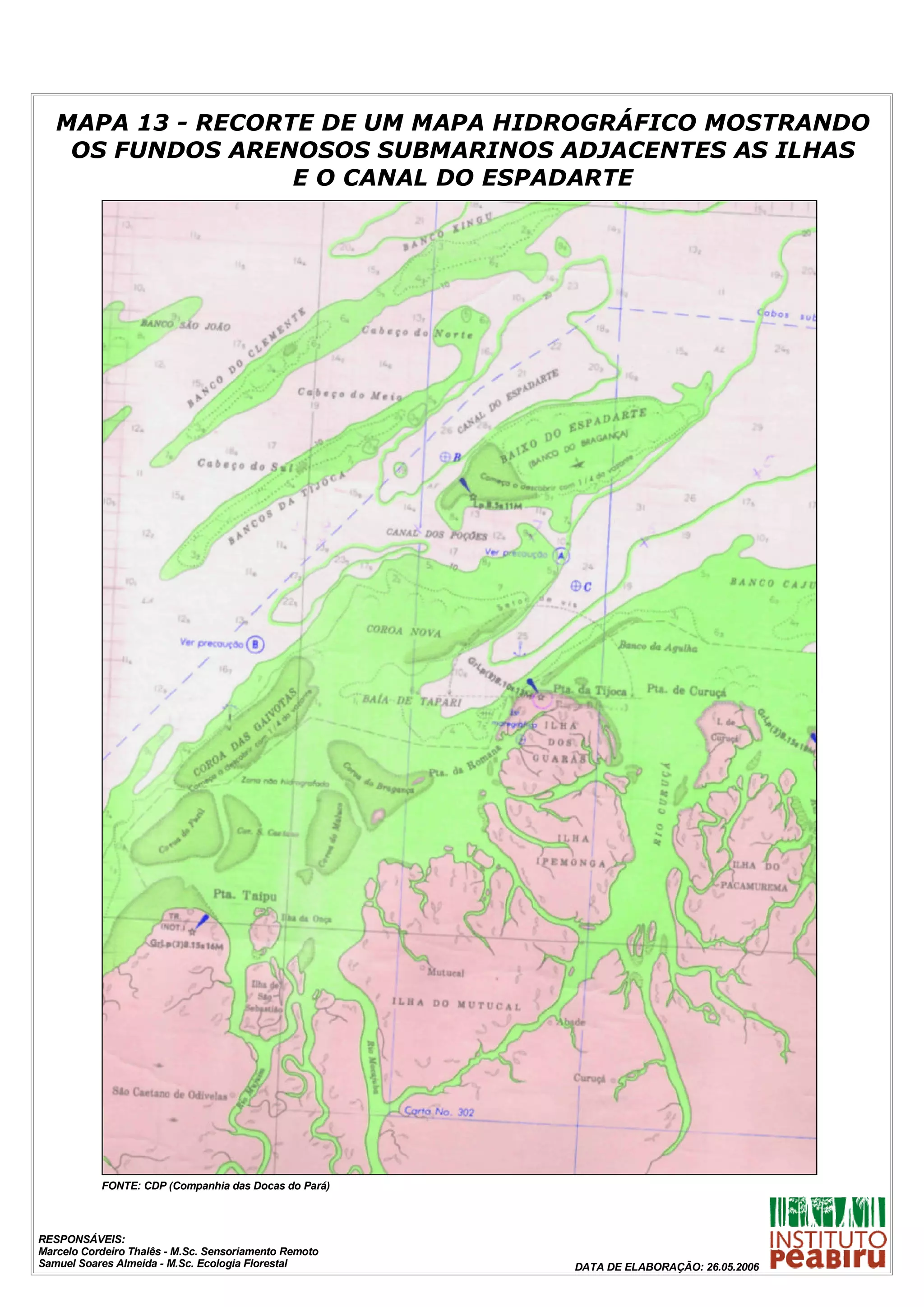 O mapa mostra os fundos arenosos submarinos e o canal do Espadarte nas proximidades das ilhas adjacentes à foz do rio Amazonas. Foi elaborado pela Companhia das Docas do Pará em 26 de maio de 2006 por dois mestres em sensoriamento remoto e ecologia florestal.