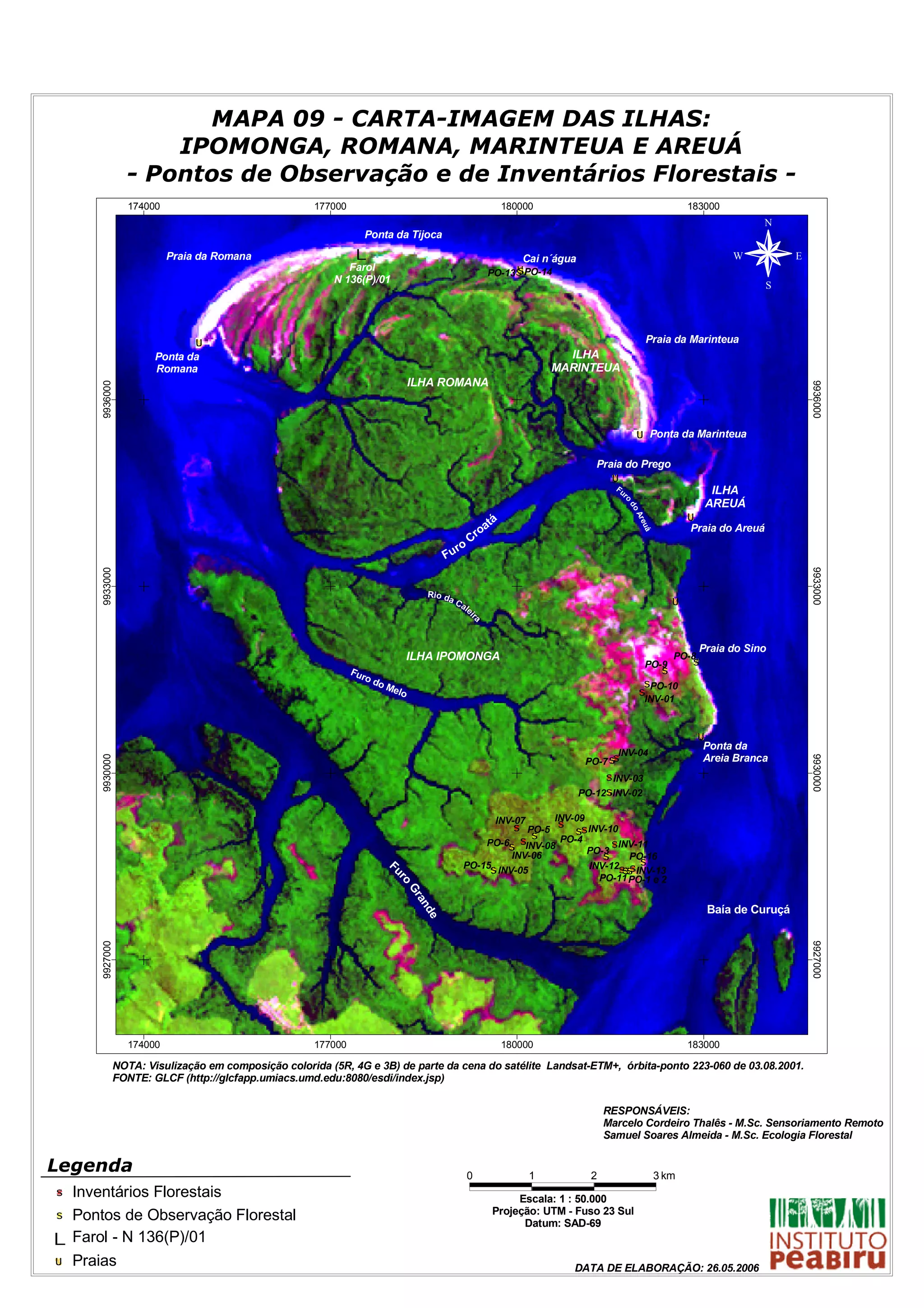 Este mapa mostra as ilhas de Ipomonga, Romana, Marinteua e Areuá no estado do Pará, Brasil. Ele destaca pontos de observação e inventários florestais nas ilhas, bem como praias, o farol N 136(P)/01 e detalhes da vegetação. O mapa foi gerado a partir de imagens do satélite Landsat e tem o objetivo de fornecer informações sobre os recursos florestais nas ilhas.