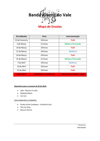 A banda juvenil do Vale terá ensaios semanais aos sábados e terças-feiras durante os meses de fevereiro a abril, focando em diferentes instrumentos a cada sessão. Eles se apresentarão em 22 de abril nas Caldas S. Jorge, onde tocarão Aida, Radetzky March e Can Can, além de trabalharem em outras músicas como Pirates of the Caribbean e The Lion King.