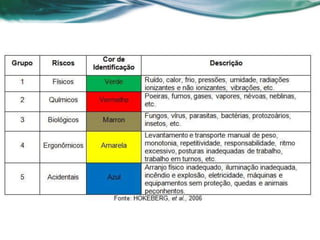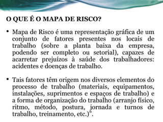 O documento descreve o que é um Mapa de Risco, que é uma representação gráfica dos riscos à saúde dos trabalhadores presentes no local de trabalho. Ele identifica os objetivos de conhecer os riscos, medidas preventivas, indicadores de saúde dos trabalhadores e realizar levantamentos ambientais. O mapa de risco representa esses riscos por meio de círculos de diferentes cores e tamanhos codificando o tipo, nível e número de trabalhadores expostos a cada risco.