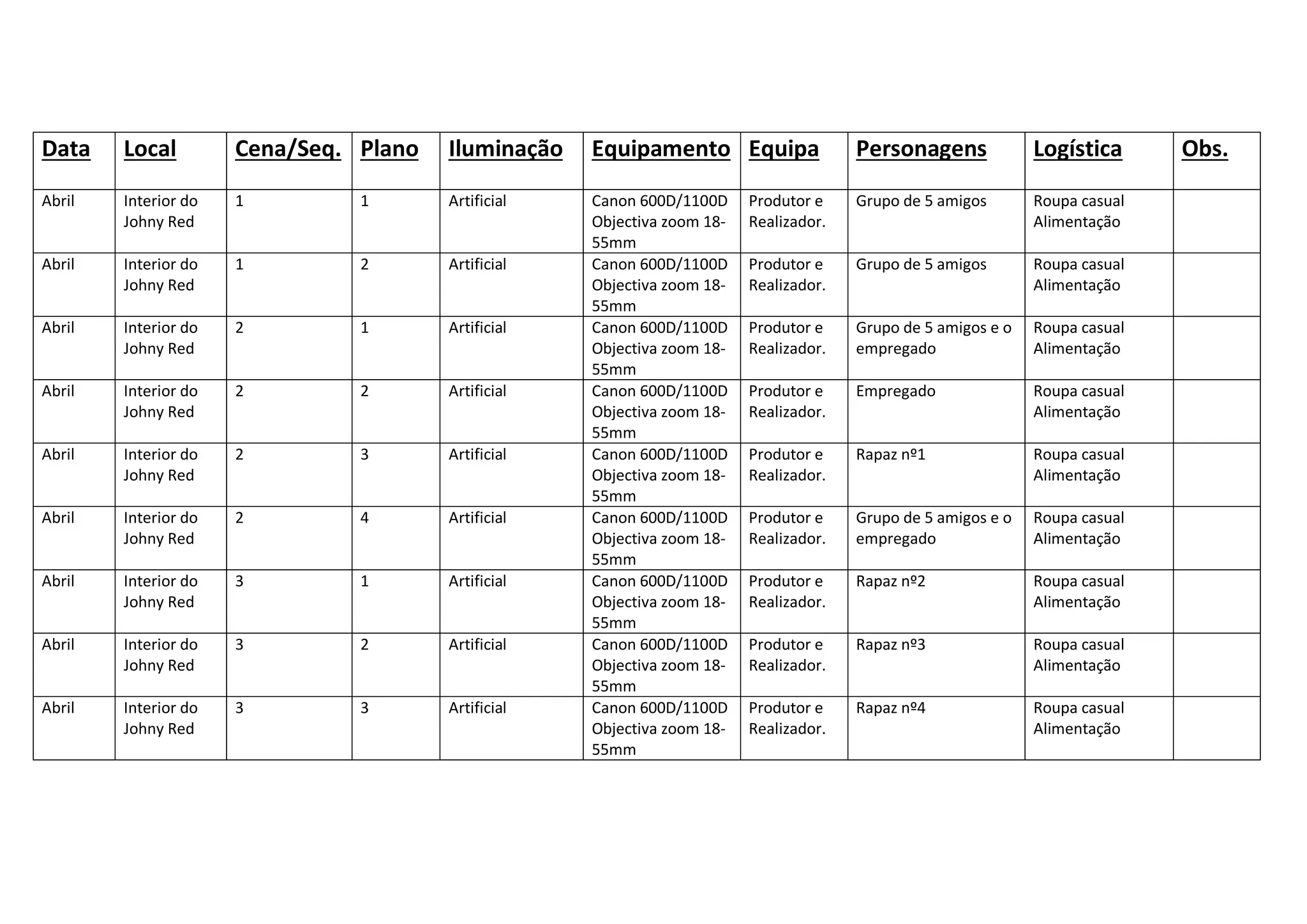 O documento lista detalhes de produção de uma gravação audiovisual realizada em Abril no interior do bar Johnny Red. A produção usou câmeras Canon e lentes zoom para gravar 4 cenas com diferentes planos envolvendo um grupo de 5 amigos, empregados do bar e tomando café em um ambiente iluminado artificialmente.