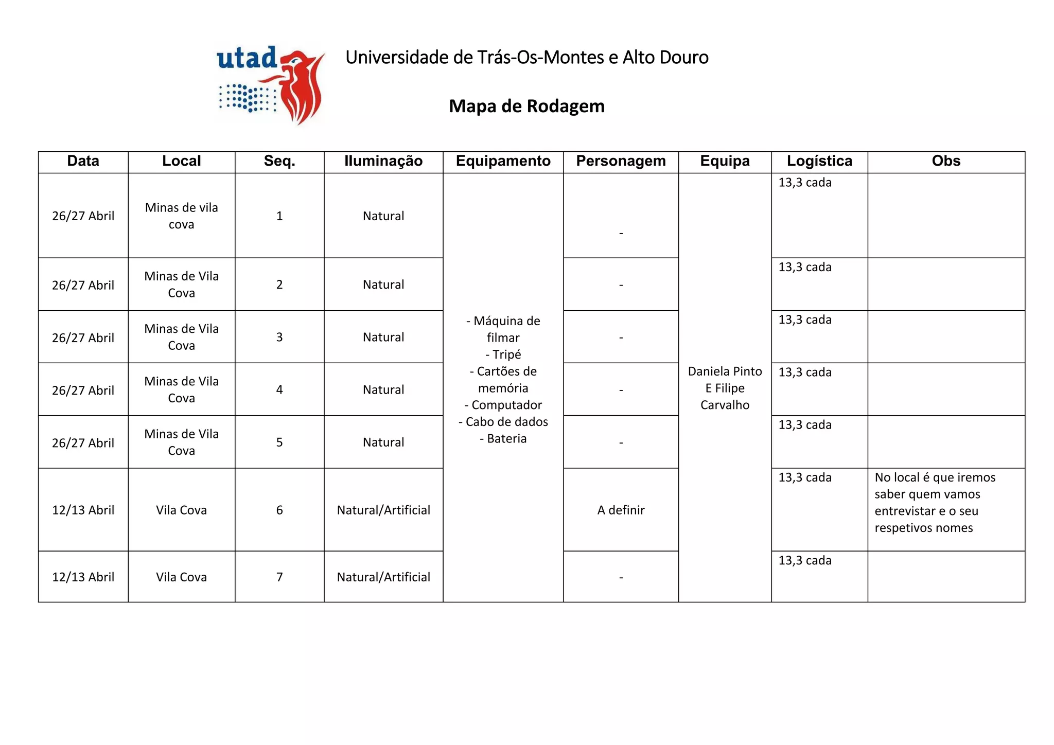 Este documento apresenta um mapa de rodagem para um projeto de filmagem em Minas de Vila Cova entre 26-27 de Abril e 12-13 de Abril. Detalha as locações, tipo de iluminação, equipamento necessário e pessoas envolvidas em cada dia de filmagem.