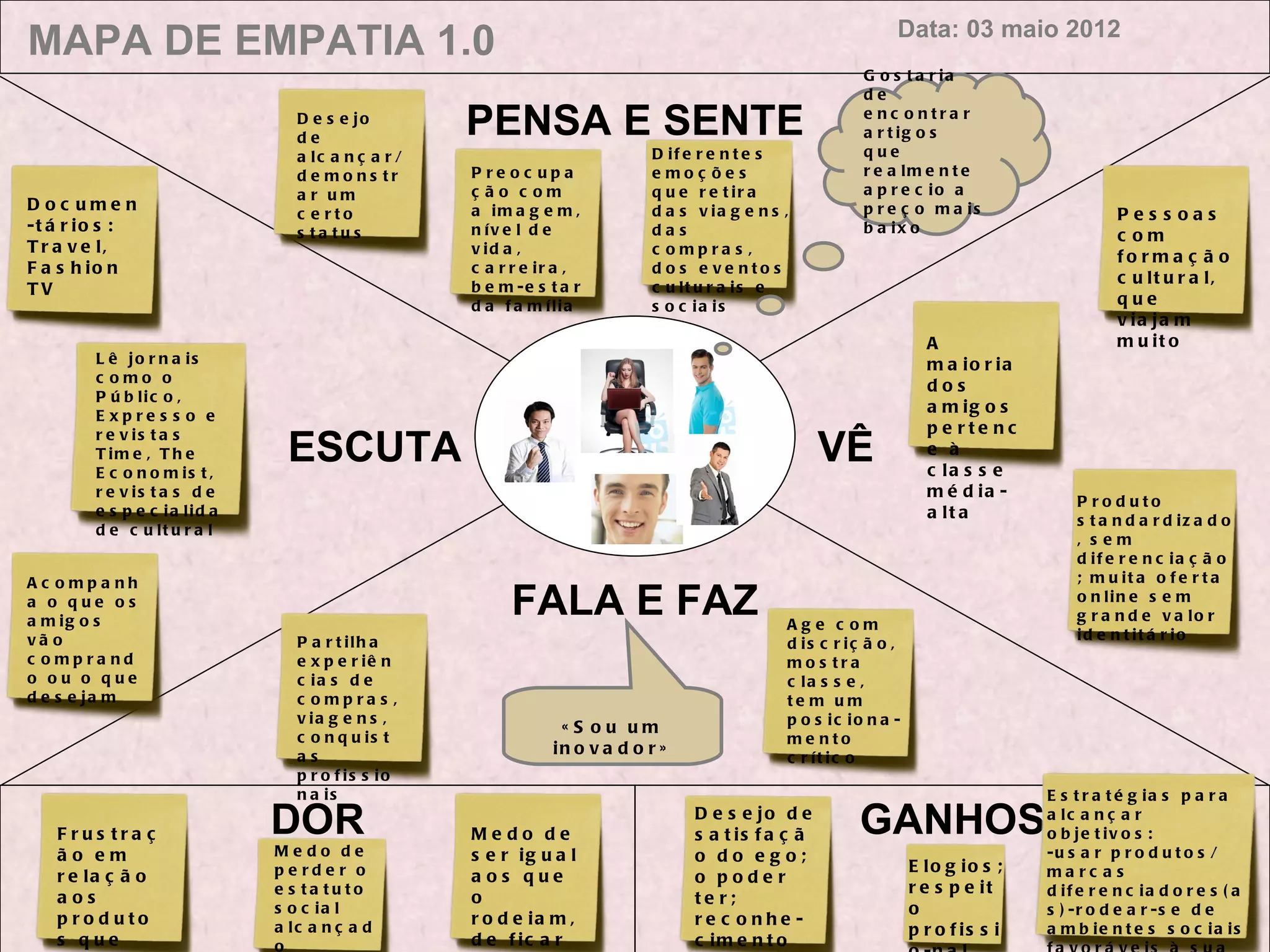 1) O documento apresenta um mapa de empatia para entender como uma pessoa pensa, sente e age em relação a viagens, compras e eventos culturais.