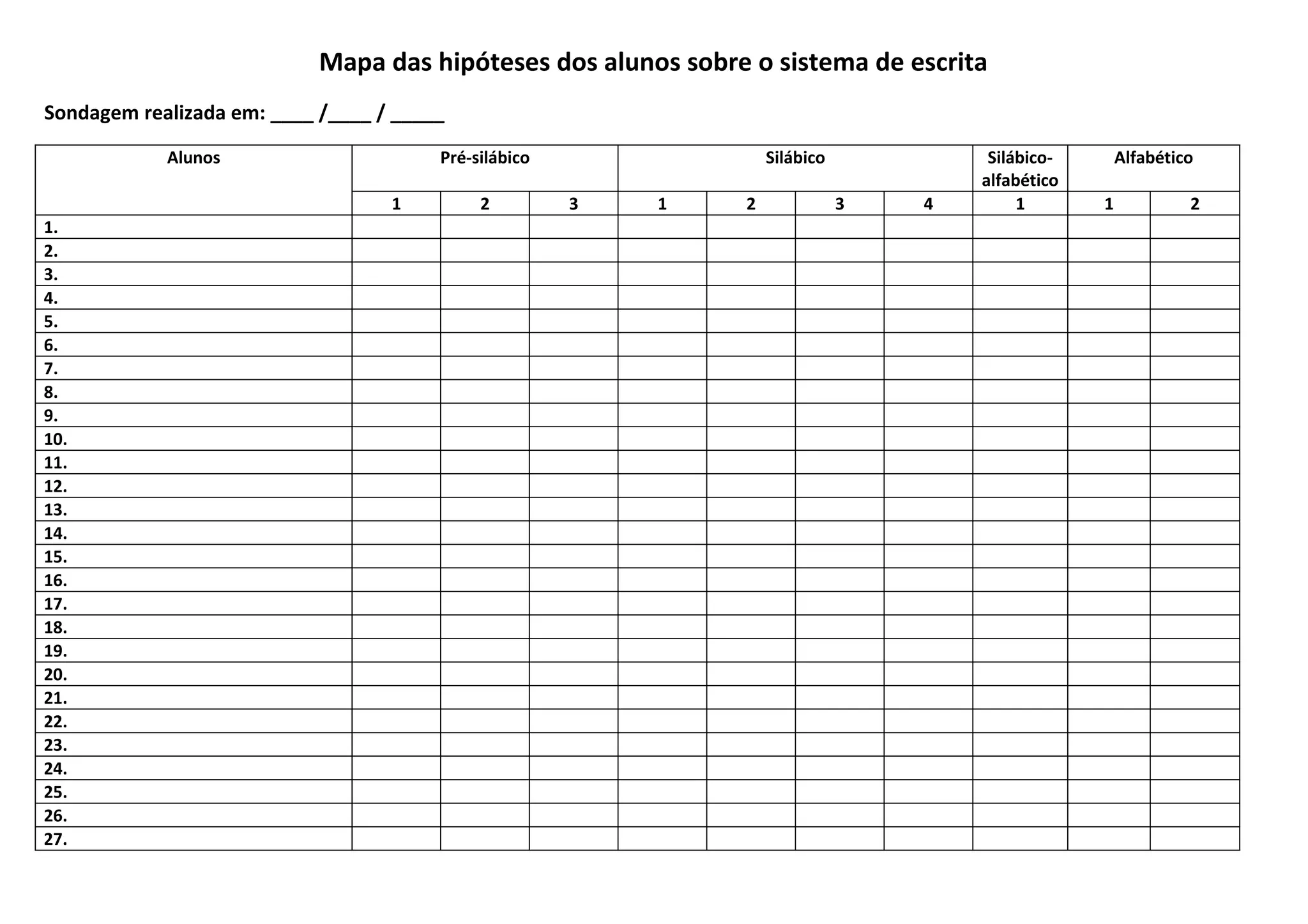 1) O documento apresenta um mapa das hipóteses dos alunos sobre o sistema de escrita, dividido em categorias como pré-silábico, silábico e alfabético.