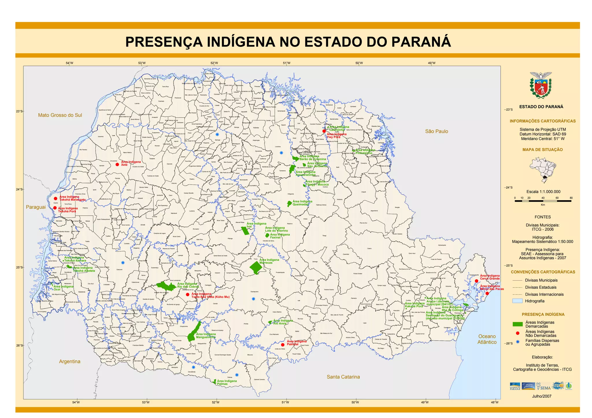 Este mapa mostra as áreas indígenas demarcadas e não demarcadas no estado do Paraná, bem como a localização de famílias indígenas dispersas. As terras indígenas estão localizadas principalmente no oeste e sudoeste do estado. O mapa fornece informações sobre a presença indígena na região e a localização das principais reservas e terras indígenas.