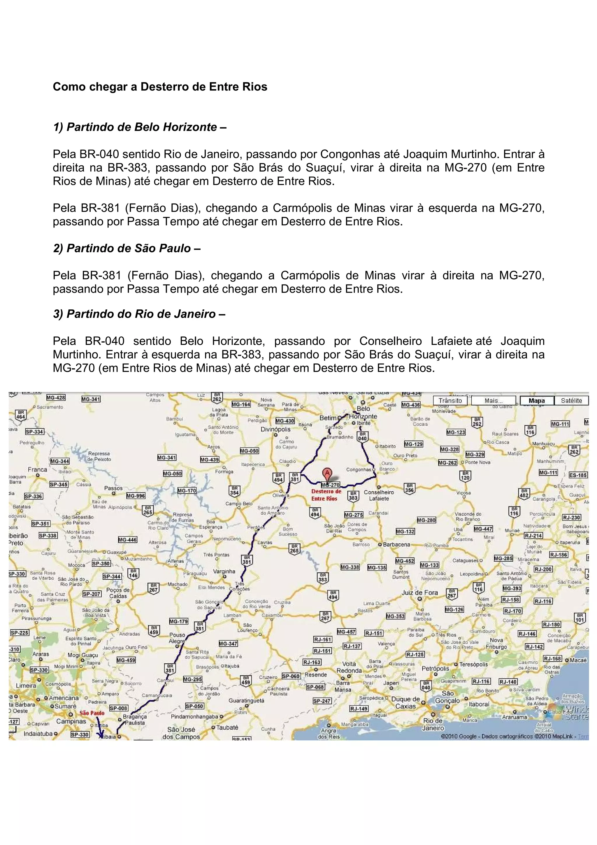 Para chegar em Desterro de Entre Rios, é possível partir de Belo Horizonte, São Paulo ou Rio de Janeiro seguindo as rodovias BR-040, BR-381 ou BR-383 até Entre Rios de Minas, onde se vira à direita na MG-270 e segue até Desterro de Entre Rios, passando por cidades como Joaquim Murtinho, Carmópolis de Minas e Passa Tempo.