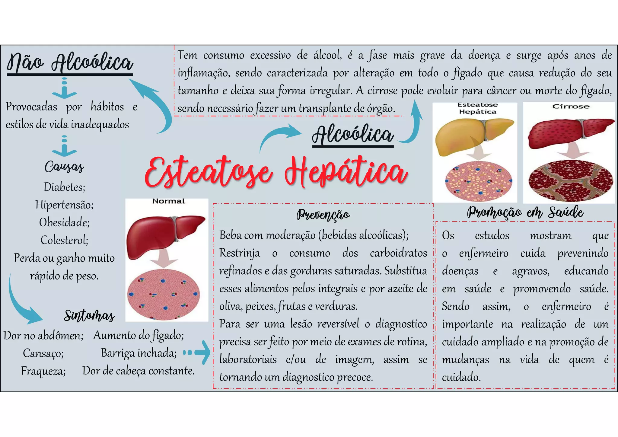 O documento discute sintomas e causas de doenças como diabetes, hipertensão e obesidade. Ele também discute hábitos alimentares saudáveis e o papel do enfermeiro na prevenção de doenças e promoção da saúde por meio da educação. Finalmente, descreve os estágios da cirrose hepática causada pelo consumo excessivo de álcool.
