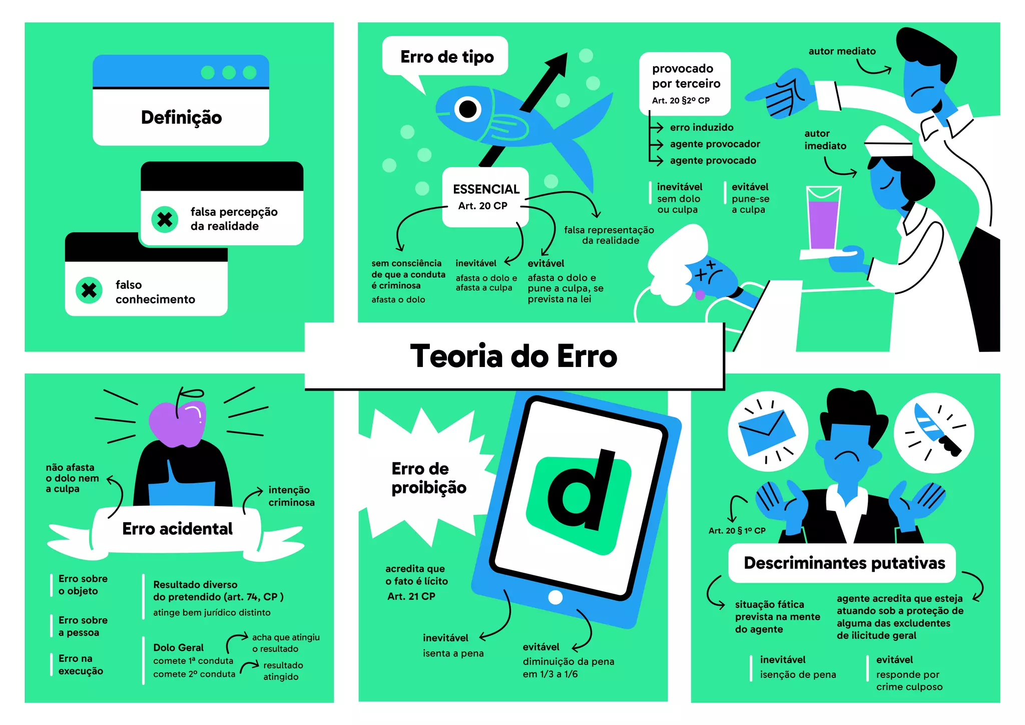 O documento discute os conceitos de erro de tipo, erro acidental e discriminantes putativas no Código Penal brasileiro. Apresenta as definições de erro inevitável, que afasta o dolo e a culpa, e erro evitável, que afasta o dolo e pune a culpa se previsto em lei. Também aborda o agente provocado e como isso não afasta o dolo nem a culpa de acordo com o artigo 20 do Código Penal.