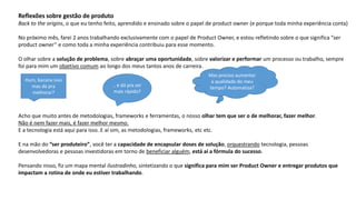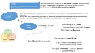 O documento reflete sobre o papel de Product Owner e como a experiência do autor contribui para esse papel. Ele discute que ser Product Owner envolve maximizar valor, guardar a visão do produto e entregar valor para clientes de forma centrada no cliente. Também destaca que os títulos e cargos não importam tanto quanto os conceitos e responsabilidades do papel.