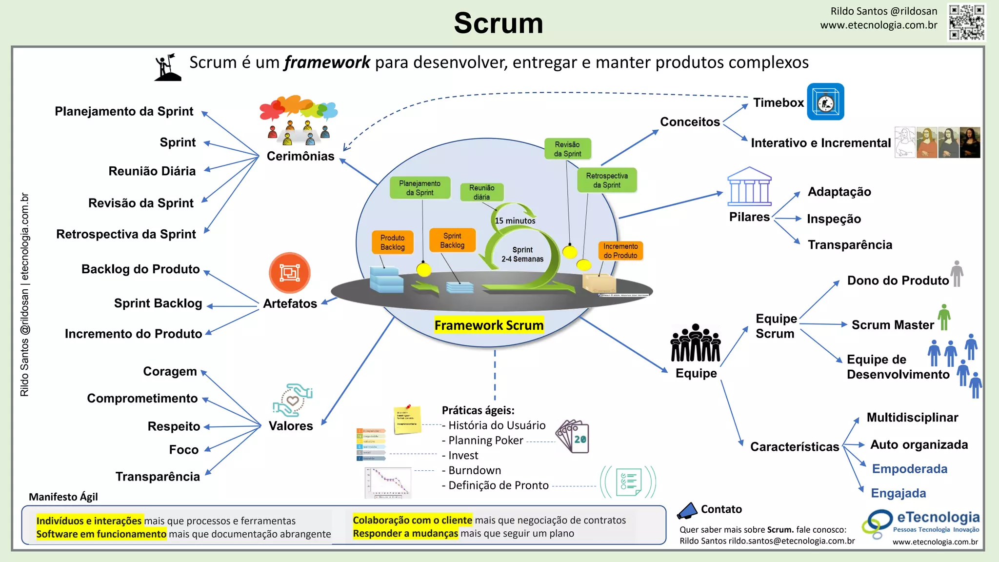 O documento apresenta uma visão geral do framework Scrum, destacando seus principais pilares, como adaptação, inspeção e transparência. Discute as características da equipe Scrum, as cerimônias e artefatos envolvidos no processo, além dos valores fundamentais. Também relaciona o Scrum com práticas ágeis e o Manifesto Ágil.
