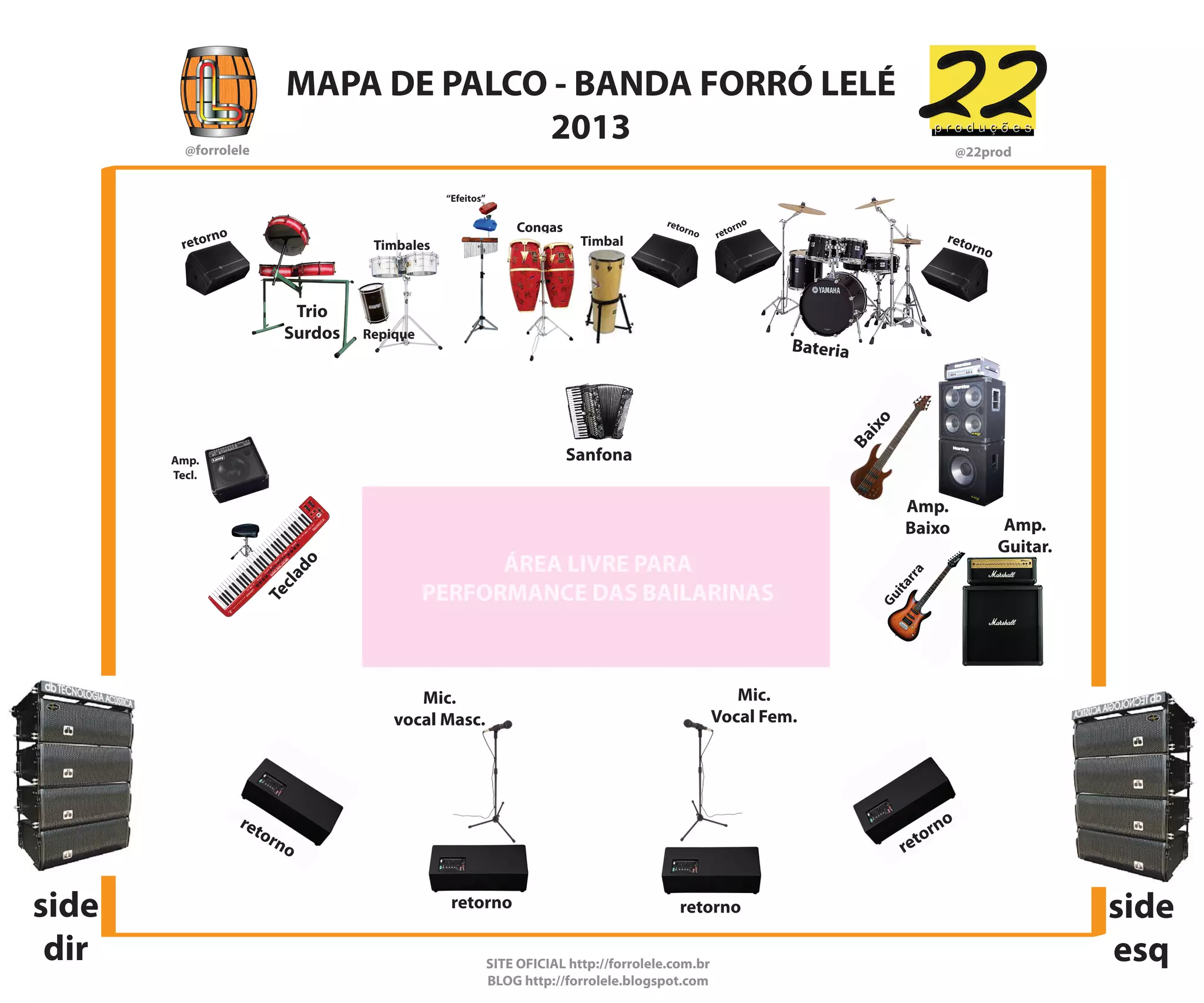 O mapa de palco mostra a disposição dos instrumentos musicais e equipamentos de som para uma apresentação da banda Forró Lelé. A bateria fica no centro com sanfona, teclado e baixo à frente. Há espaço para as bailarinas e microfones para os vocais masculino e feminino.