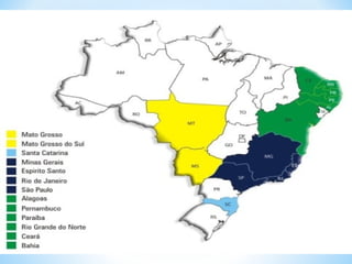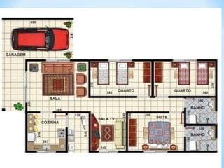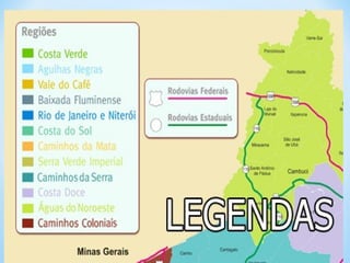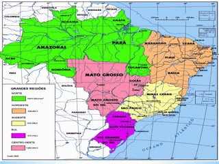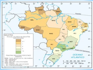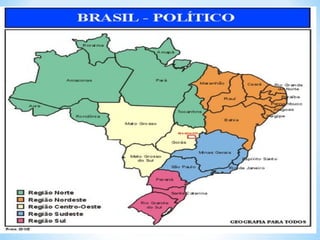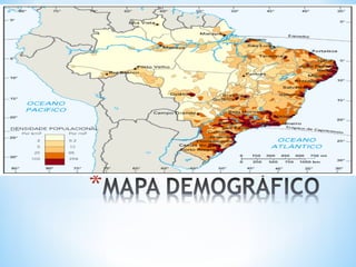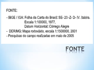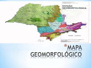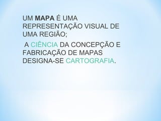 O documento descreve os principais elementos de um mapa, incluindo título, escala, legenda, orientação, fonte e coordenadas geográficas. Também discute os diferentes tipos de mapas como geomorfológico, climático e político.