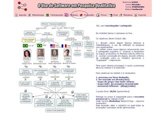 O documento discute as técnicas de mapeamento para pesquisa, aprendizagem e projetos. Ele explica o que são mapas e como eles podem ser usados para organizar informações em áreas geográficas e digitais. Também discute como mapas ajudam a desconstruir conceitos para reconstruir novos pensamentos e conectar diferentes áreas do conhecimento. Finalmente, apresenta alguns softwares para mapeamento como Concept Mapping, Mind Mapping e Compendium.