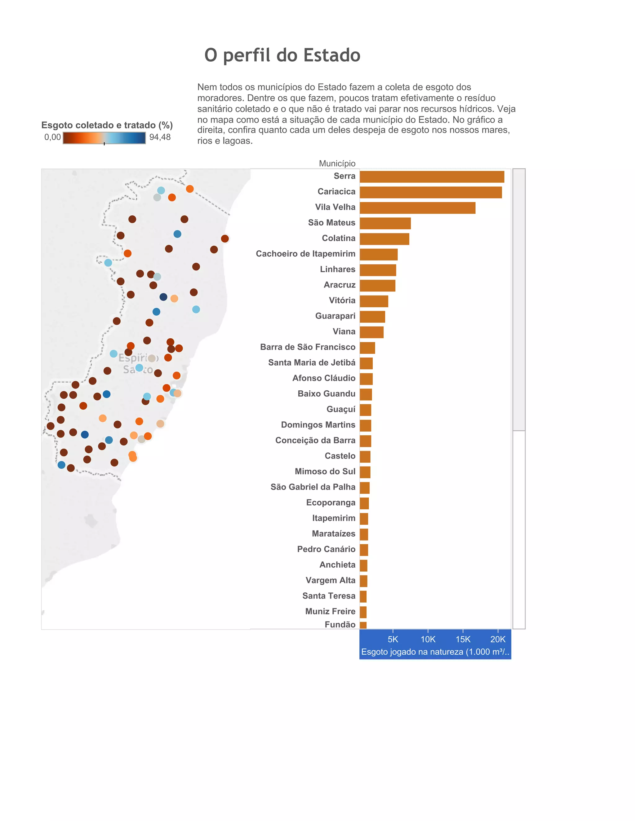 Este documento apresenta dados sobre a coleta e tratamento de esgoto em municípios do estado do Espírito Santo. O mapa mostra a situação de cada município, se coleta ou não esgoto de todos os moradores, e se trata ou não o esgoto coletado. O gráfico à direita indica a quantidade de esgoto despejado na natureza por cada município.