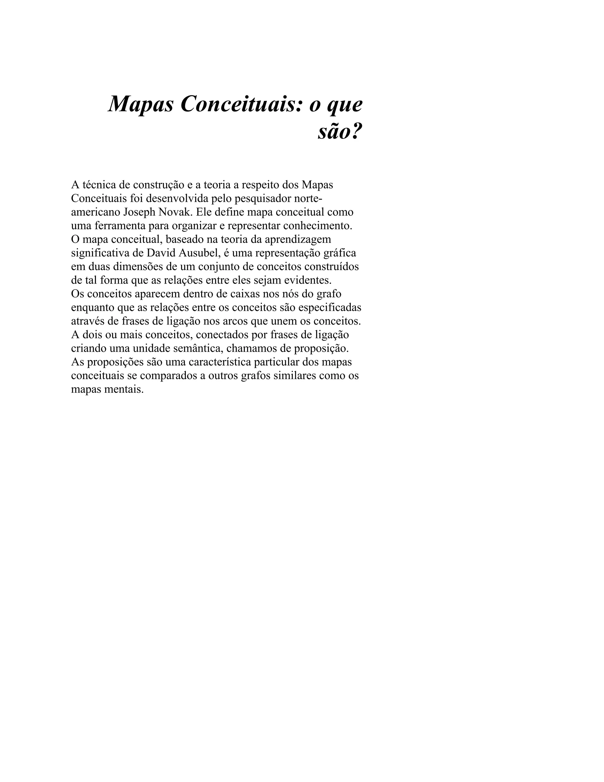 Mapas conceituais são ferramentas para organizar e representar conhecimento desenvolvidas por Joseph Novak. Eles são representações gráficas de conceitos e suas relações, com os conceitos em caixas e as relações especificadas por frases de ligação entre os conceitos.