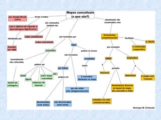O documento discute mapas conceituais, definindo-os como redes que representam conceitos e objetos ligados por descritores de relações. Explica que mapas conceituais têm sido usados para mapear conteúdos educacionais e avaliar aprendizagem, permitindo que professores e alunos organizem e analisem conhecimento. Também descreve como mapas conceituais podem ser construídos e utilizados como estratégias de estudo, apresentação e avaliação, assim como ferramentas de aprendizagem para estudantes e professores