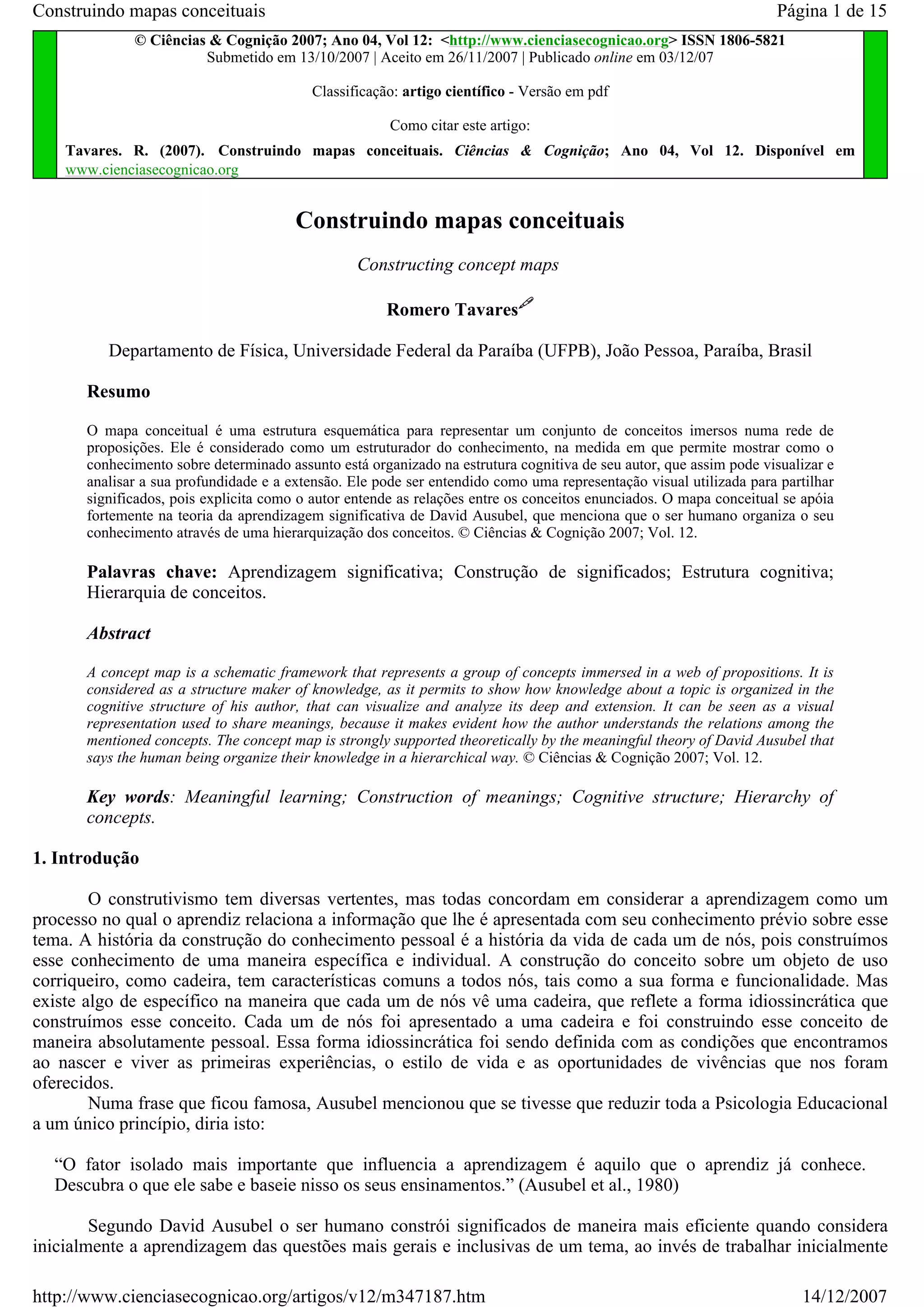 O documento discute a construção de mapas conceituais como uma ferramenta para organizar o conhecimento de forma hierárquica. Mapas conceituais podem ser construídos usando diferenciação progressiva, onde conceitos mais amplos são desdobrados em conceitos mais específicos, ou reconciliação integrativa, onde conceitos aparentemente distintos são relacionados. Mapas conceituais apoiam-se na teoria de aprendizagem significativa de Ausubel e podem facilitar a aprendizagem ao ajudar o aprendiz a identificar