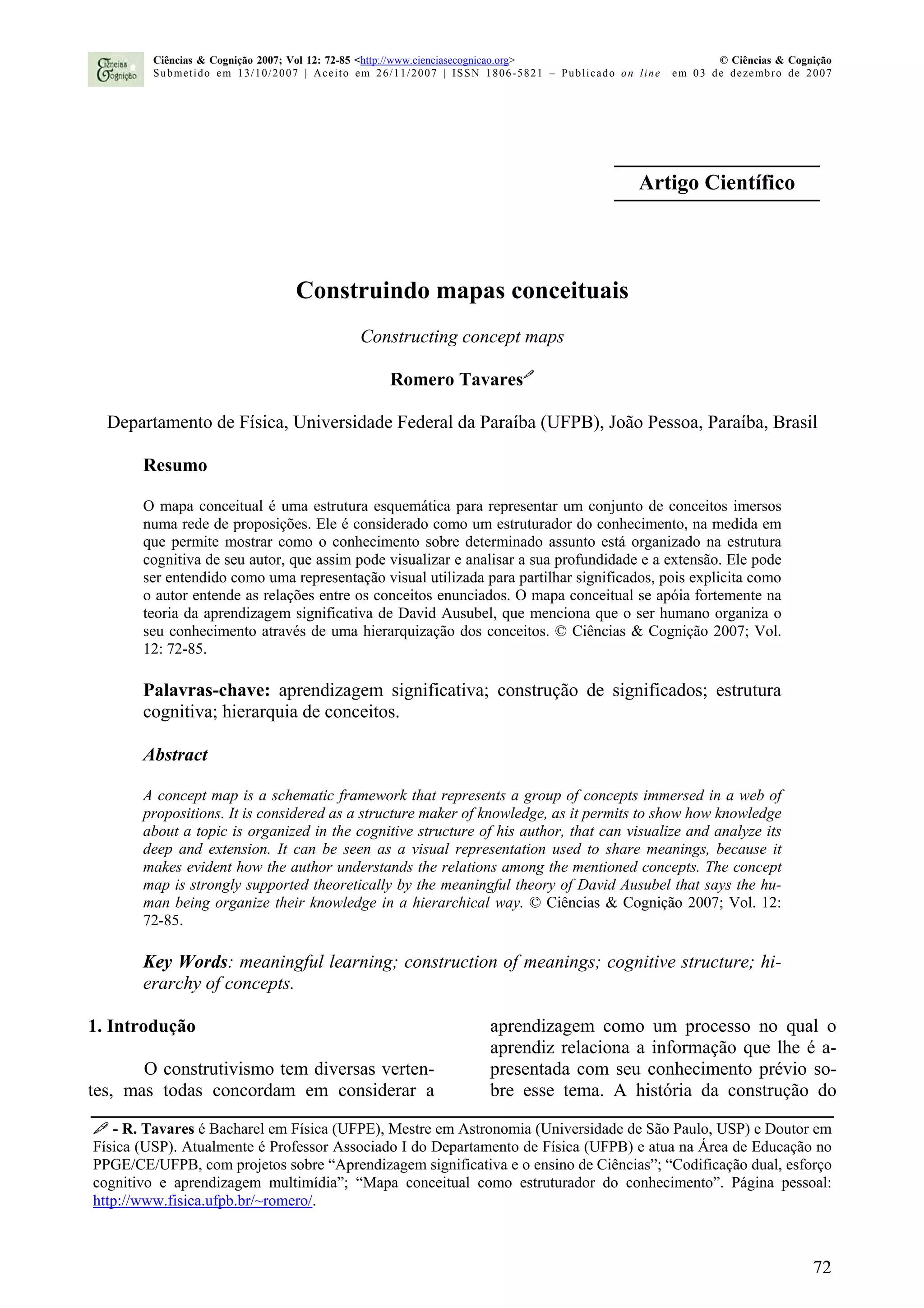 1) O documento discute a construção de mapas conceituais como uma estrutura para representar conceitos e suas relações.