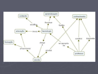 Mapas conceituais são ferramentas para organizar e representar conhecimento através de conceitos e suas relações. Eles possuem proposições entre conceitos ligados por verbos ou frases. Sua construção envolve escolher conceitos e relações entre eles expressas por frases de ligação.