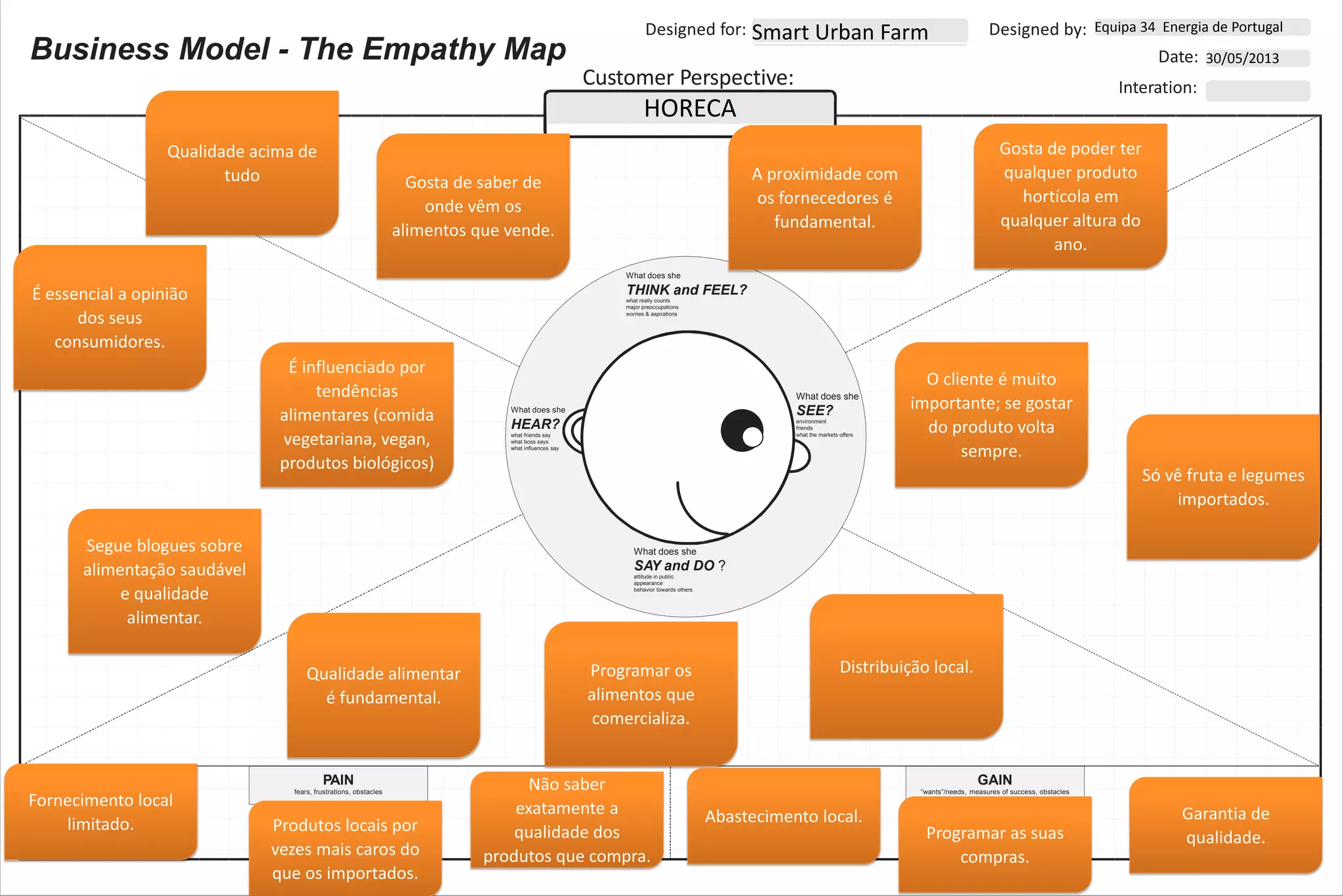 O documento descreve dois perfis de empatia: o HORECA e o consumidor final. O HORECA valoriza a qualidade dos alimentos, a proximidade com os fornecedores e a opinião dos clientes. O consumidor final aprecia a vida familiar, a sustentabilidade e cozinhar com vegetais, mas teme não saber a origem dos alimentos ou ter de comprar importados.