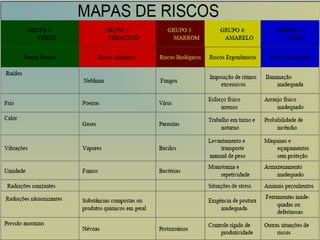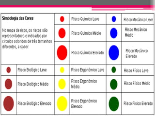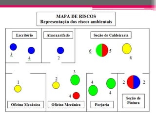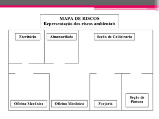O documento descreve a construção de mapas de risco ambiental nos locais de trabalho, que identificam os riscos à saúde dos funcionários. Os mapas de risco tornaram-se obrigatórios para empresas com CIPA na década de 1990 e fornecem informações visuais sobre os riscos físicos, químicos e biológicos por meio de círculos de cores e tamanhos proporcionais. Eles auxiliam na prevenção de acidentes e doenças ocupacionais.