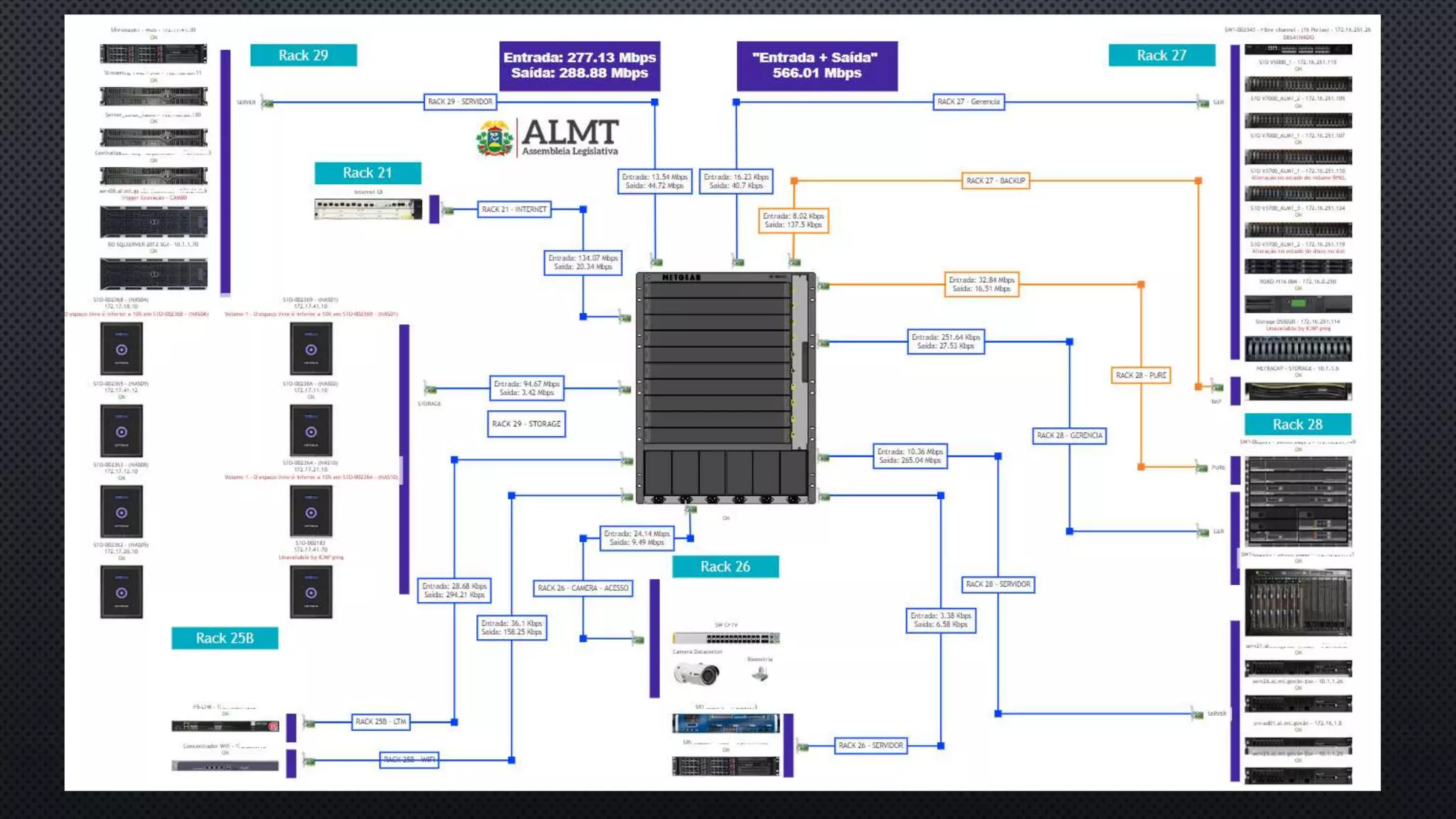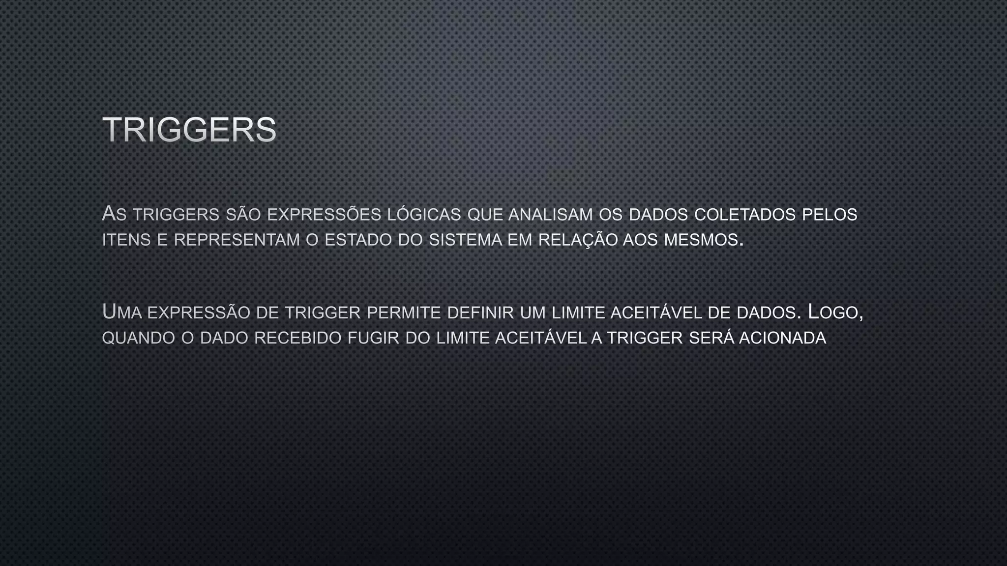 O documento aborda vários triggers relacionados ao desempenho e armazenamento, como throughput, gravação de movimento e uso de banda. Também menciona aspectos como compartilhamentos ativos, latência e configurações de discos RAID. Esses fatores são cruciais para a otimização do sistema.